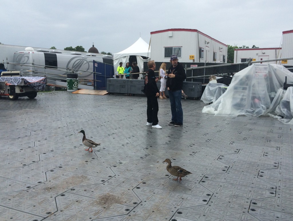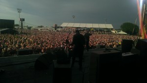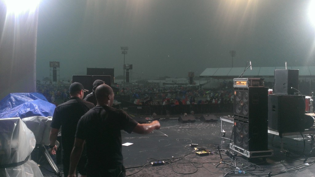 Not to say it was easy. This was a rough one. The crew loaded in most of the equipment late the night before, but were not allowed to make noise and were cut off long before completion due to curfews. All of which required an early morning return at dawn to complete the set up. We’d seen hard rain and wind the day before, so we moved our equipment back on the stage to leave room for other bands but covered everything in plastic to prevent coming rain damage. Only a few hours later, huge rains and wind darkened the sky, forcing one band to cancel mid-show. The extreme wind caused us to reinforce and rework the rain protection. The front of stage was fully soaked, with cables in an inch of standing water toward the front of the stage. Local hands swept water away as it was discussed whether to stop the shows or not; yet, as it was predicted, the rain would abate before The Who set, we were promised.