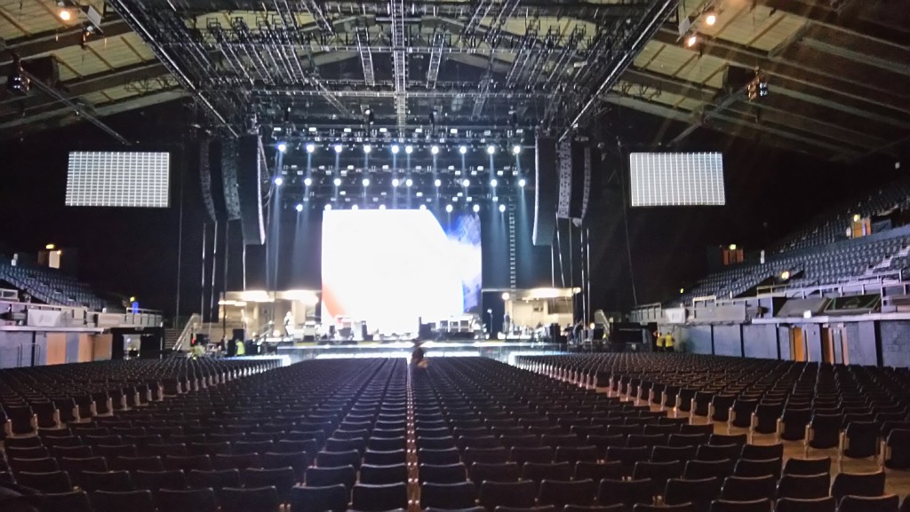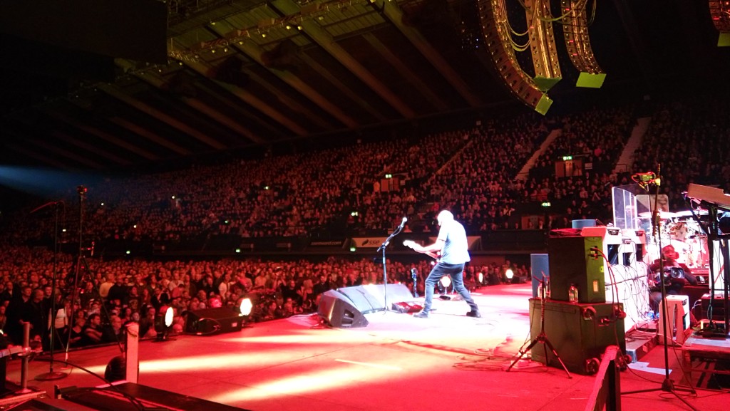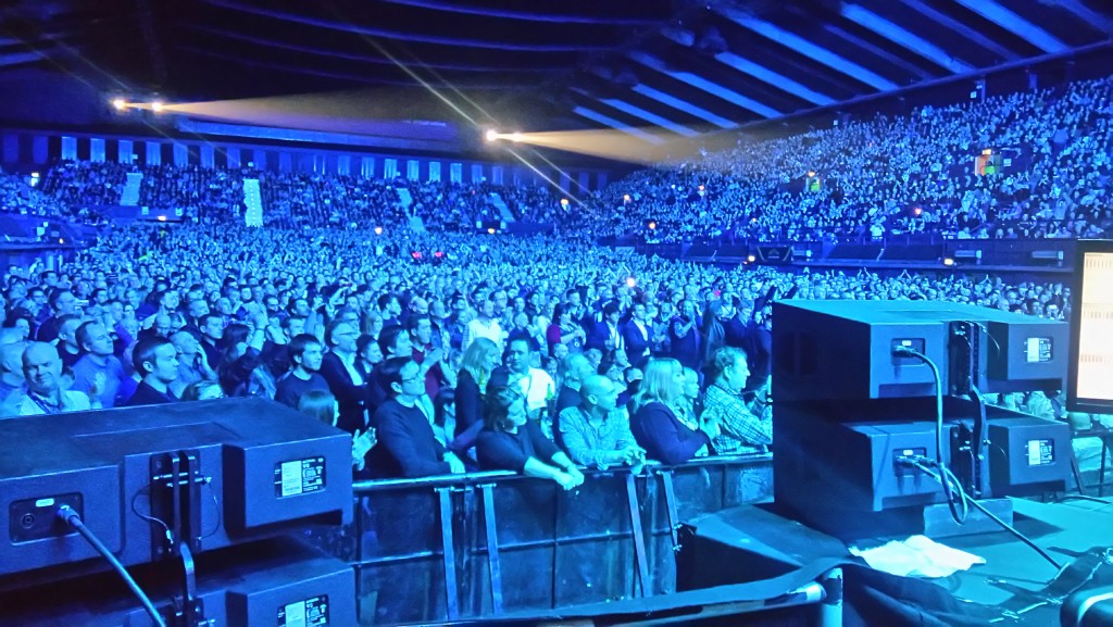 Roger mentioned that they’d spent “billions” on the Wembley stadium right next door, and leave this arena “the p—hole that it always was!” It’s known to be a lesser place, sonically, to play. But our front-of-house mix engineer Robert Collins has done it many times before and had a great LOUD sound. In past years, the PA and room sound had really bothered Pete and Roger, bouncing back to the stage, but their use of in-ear monitors now makes the house echo much less of a problem, and the PA level can be louder, as a rock band should be! I’ve noticed they did one very smart thing; horizontal black cloth banners hanging from the roof overhead, all over the seating area. This doesn’t block anyone’s vision to the stage, but it keeps down the echo and bounce that plague many arenas we play. Smart and easy, why don’t more places do this?