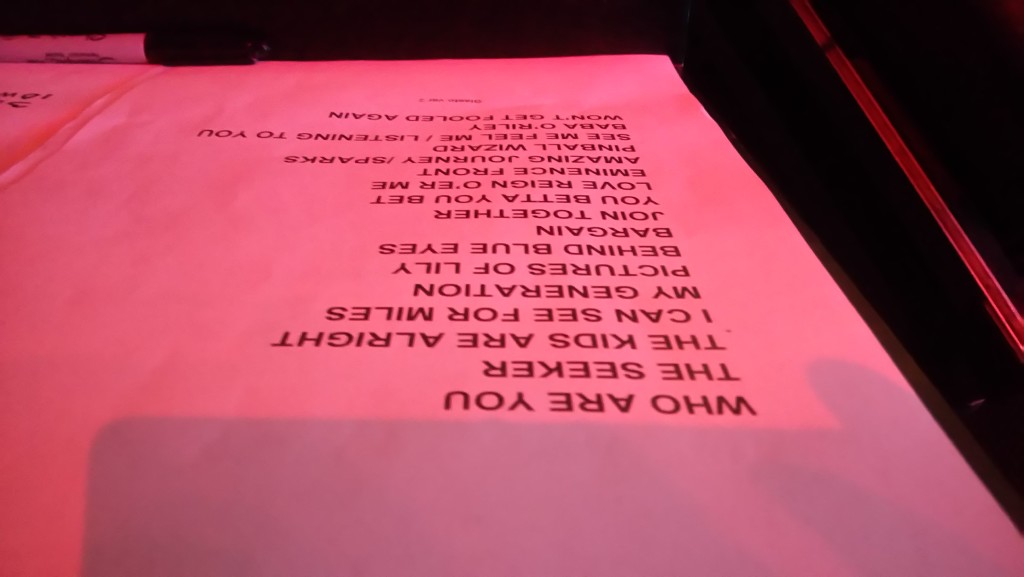 By the next song break, another setlist came out and was taped down. Pete thought it was a new sequence of songs, or something, until he looked at it; they’d managed to print out the same setlist in double-sized type, so he could read it from where he stood. He then noted the large senior-accessible type and said the next song was also ironic, given the scene: ‘My Generation’!