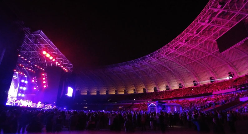 Secondly, this was to be much smaller than the other shows just before. (Especially that last show in Rio, which was more than twelve times this size.) The event has sold something like 7,000-8,000 tickets. Not a lot of bodies, especially in a huge stadium that holds many times this amount (they use it for all kinds of events, but it’s mainly designed for futbol/soccer. For different-sized concerts (like ours) they move the stage location to work with the audience size. We’re down in a third of the field, so several thousand people stand and fill the field, and about a double number fill the seats up in the stadium bleachers.
