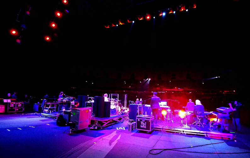 Def Leppard did a great show – certainly pleased the audience. Many of our crew went out front to watch, which was the place to be. Out in front, the PA system is LOUD and clear. I was quite impressed by their mix – as people say, “they sound like a record” as they have layered guitars and voices with the thick effects of a finished/produced record. They have figured out ways to achieve their complex studio sound in a live setting. Plus – they have a huge video system going all around the stage, too. It looks and sounds great, and I honestly thought we might have some trouble following them. Soon, they were done with their set, and all their gear rolled away to be packed on trucks. Ours rolled out, looking somewhat tiny in comparison, but business as usual, for us. There was even time to go on slightly early, which was good for everyone. The band came out onstage, and suddenly, it all clicked.