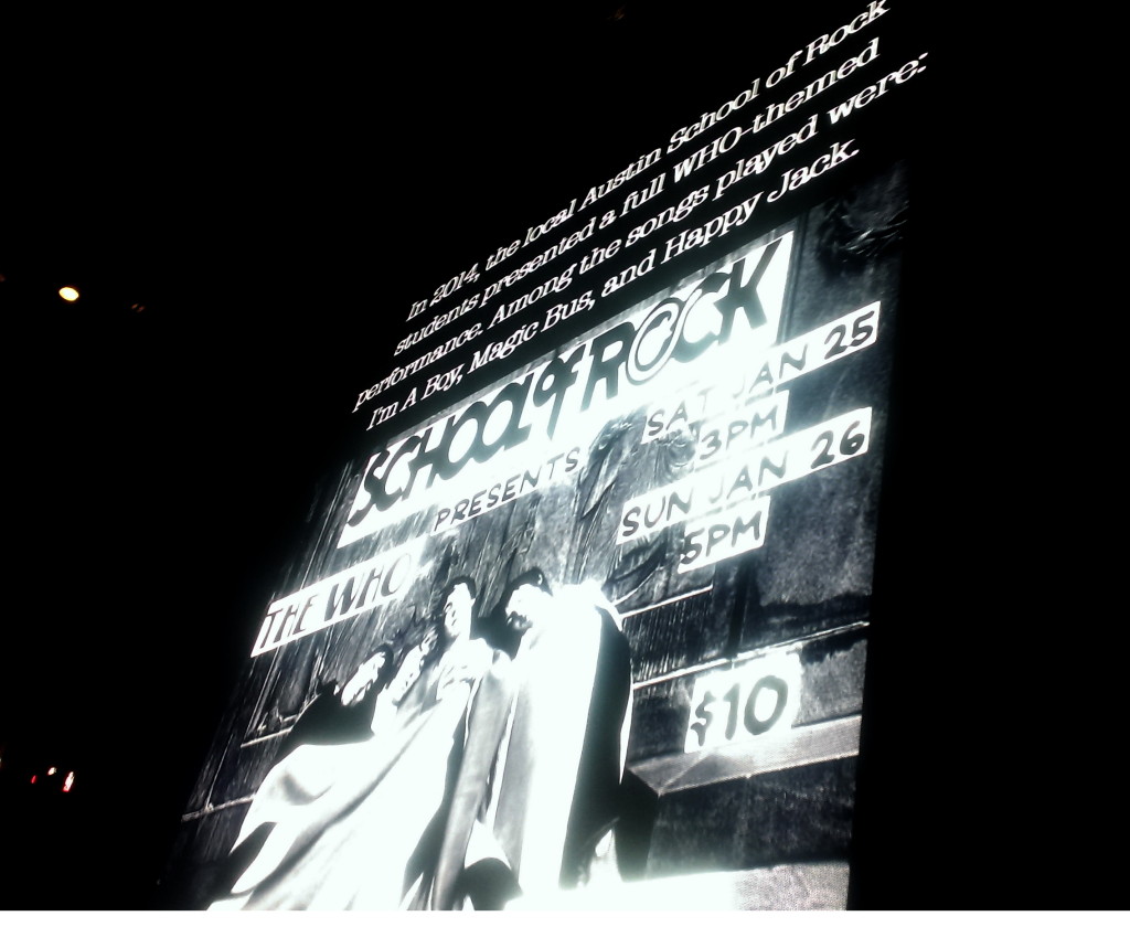 Pete mentioned to the crowd that his old friend Jeff Beck was here. But as Pete said, “So there’s at least one great guitar player in the room.” He next mentioned there were hundreds in Austin who could probably play better than he himself could. “UNFORTUNATELY . . . I’m the one you have to listen to tonight” which was followed by a huge cheer. Jeff Beck (sitting right alongside the stage) liked the rocker songs best: ‘Who Are You’, ‘Join Together’, etc. Jeff will be playing in town very soon, and is still doing amazing work every night; recommended! Roky Erickson was also around, and Joan Jett was rocking right down off the front of the stage, too. Not that any of this was pressure to perform for the band, more like musical camaraderie in a musical town.