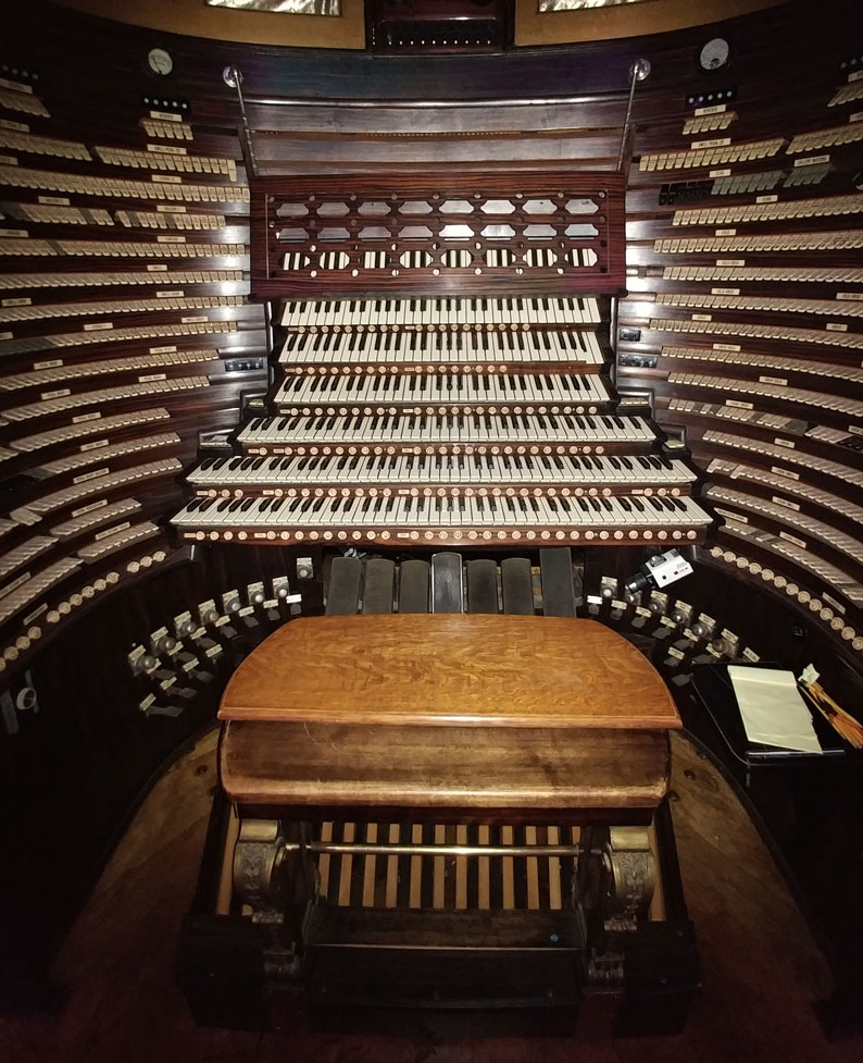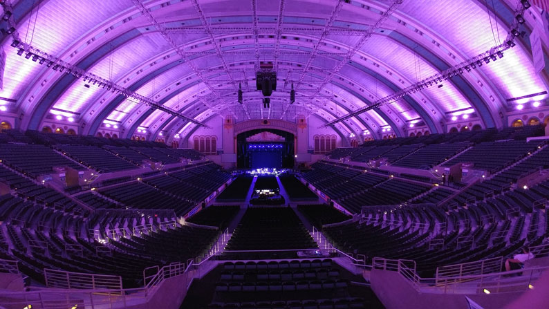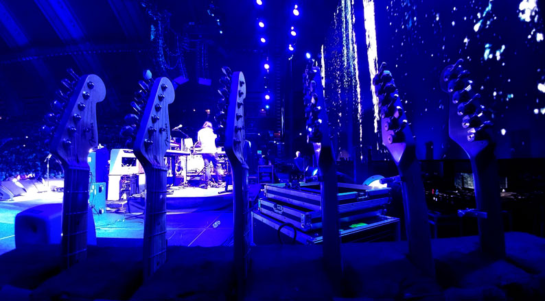 Without question, this ought to be a good show. The building itself is simply stunning, likely the most gorgeous place we will play. Built back in the 1920s, the structure has style and taste, having been largely kept up (or restored) over the years. Built right on the famous Boardwalk among the beach casinos, this is an enormous arched wooden structure. It houses the world’s biggest (and loudest, in its day) pipe organ. Not only that, it’s the largest instrument in the world! Half the organ has been restored, and someday we hope to hear it all working again. It’s a huge boomy-sounding room, but that sometimes works for a big rock concert. Even the parking lot next door is a monster, the former Convention Hall can now house hundreds of staff cars, all our buses and trucks – and still have room left for hundreds more!