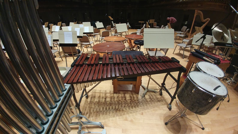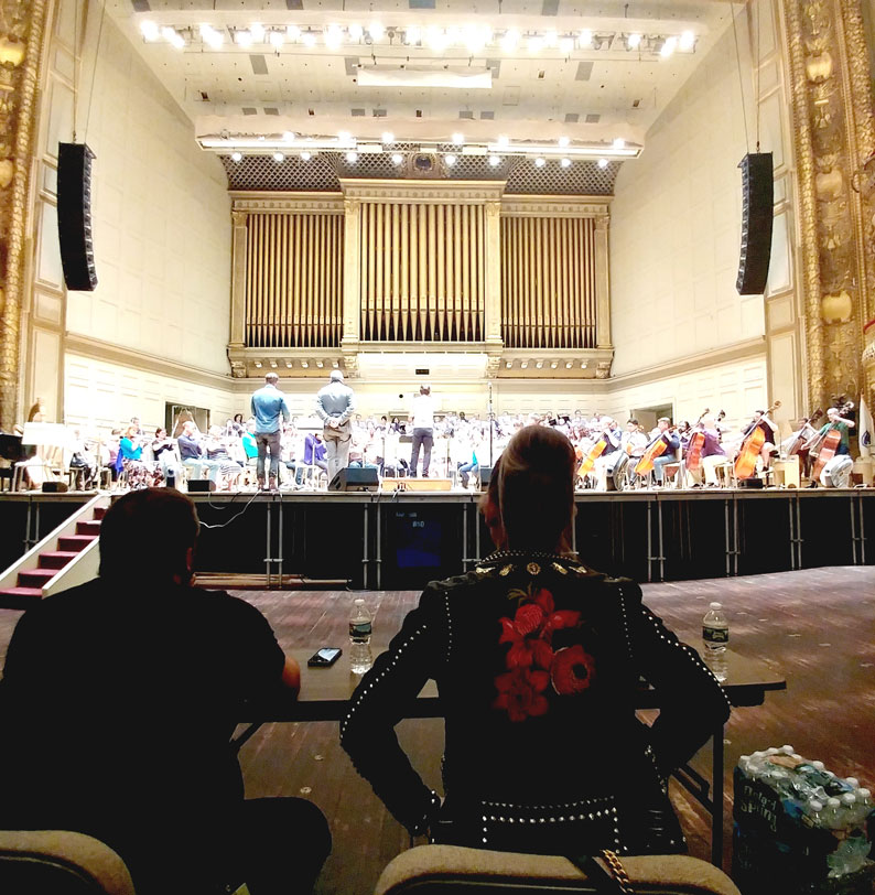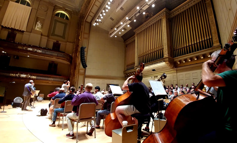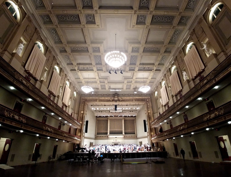 Tonight, our rehearsal space is really overqualified! Boston’s legendary Symphony Hall, built in 1900, is just a gorgeous old room. The space Leonard Bernstein called “The Big Time.” It has ornate gold-painted balconies and rich woodwork everywhere. There is a lush and friendly sound in this space, and possibly the most beautiful natural reverb I’ve ever heard, almost unreal in character and texture. (Studio people will know of Lexicon reverbs, those electronic processors that are used to add reverb to recordings. Their original designs were modelled here, as close as they could to match the original space.) No wonder so many classic recordings have been done here over the years, as the room itself really enhances the sound. It’s a shame this is not being recorded, even though it’s just a working rehearsal session, but the real shows are to come, we’re just here for a night time rehearsal.