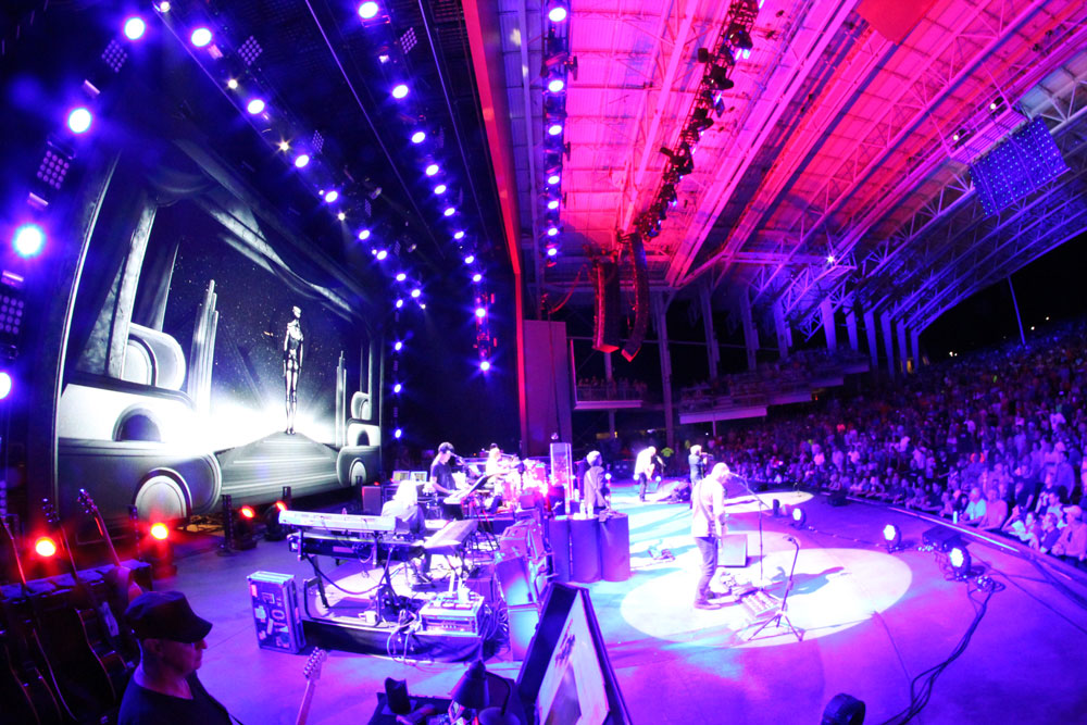 This show is in a “shed” – the touring nickname for a half-covered amphitheater: The seats in the front have a metal roof, open at the sides and back. In case of rain or blazing sun, the people who paid bigger money will be covered. Behind the seats, there is a sloped lawn, open to the sky and the weather. Luckily, today is a gorgeous sunny day, no weather problems at all. They tell us there are 5000 seats and 5000 allowed on the lawn – and we are fully sold-out! We used to play a lot of these “sheds” in 2002-2006 era, but since then have not done so many, staying mainly in arenas – partly due to touring in non-summer months.