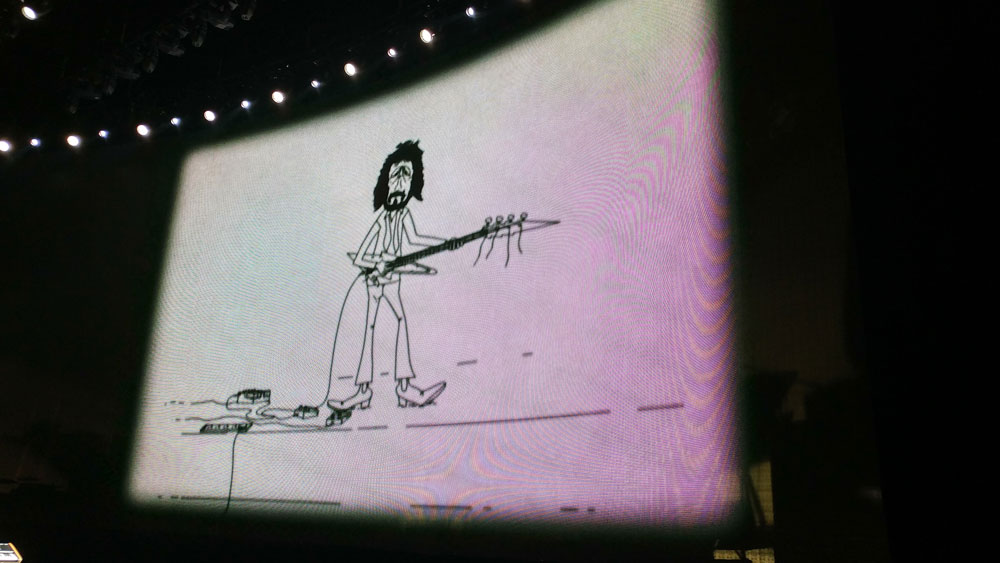 Pete said “I must have done something terribly wrong in the last concert we gave, because Roger’s making me play ‘Squeeze Box’! “ He’d joked about it a lot during rehearsal today, and it seems he really does not like it, but puts up with the desires of others to get it heard now and then. And so he played it, backed by the great animation film you may have seen before: They’ve taken the Entwistle artwork for The Who By Numbers and made short scenes of the band sabotaging each other. Pretty well-done stuff. Roger dropped his vocal out during the bridge, so after the song ended, he started singing it acapella to prove he really does know it – and the audience sang along as well. Good crowd, tonight.