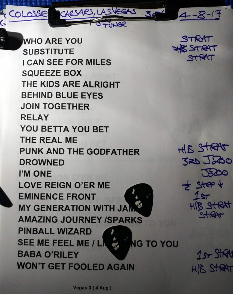 True. Roger hoped to make the Vegas stay a little interesting, and as the room/scene wasn’t changing, they ought to try to bring some musical changes. Today at sound-check/rehearsal, he threw out a set of song options to put into the show. And many made the final list. Besides that, the structure was revamped. All Pete had asked was that the ending of the show (Tommy, ‘Baba’, ‘WGFA’) stay the same as it’s so powerful and good. And it has remained.