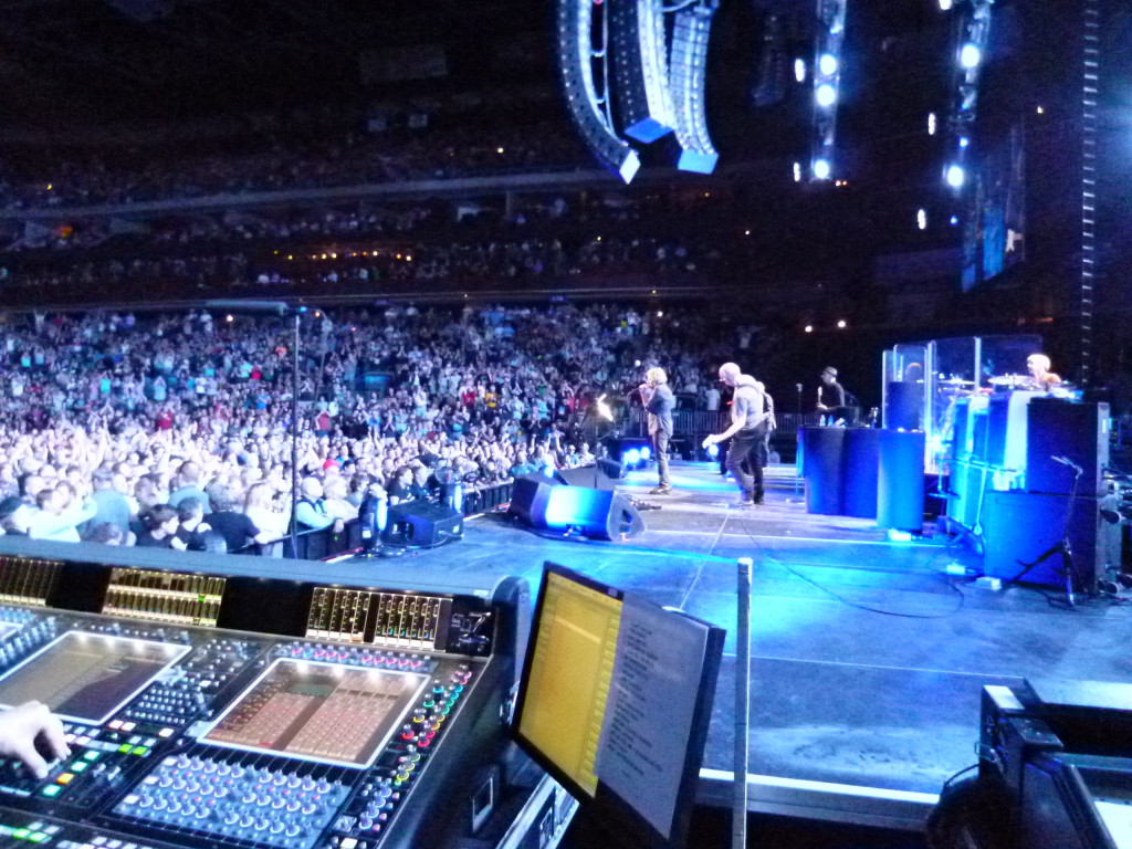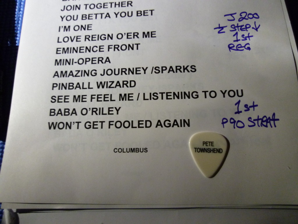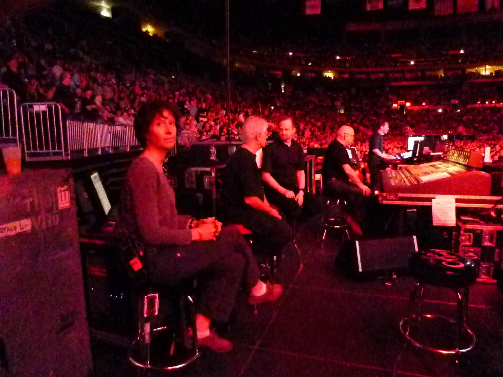 Late this afternoon, the band came in to test and sound-check the gear in the hall. Each day the VIP ticket-holders are allowed to enter early and see the band work on various things. You never know what will happen. Although the band are very honest and real in performance, the sound-check is even more candid. Today, the visitors saw some great moments: Roger was running late, so Pete was running through things with the band. At one lull, a VIP member shouted out “Happy Birthday Pete!” and Pete turned to the microphone and said “F*** off!” to the distant greeting. Then he proceeded to explain the various accents that could be used to say those two words, with a demonstration.