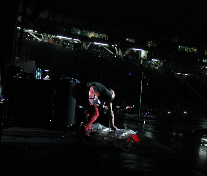 Meanwhile, it’s been a day of drizzle and even full rain. Not fun, and certainly less than comfortable, but workable. As our set time came up, the rain started in, and the front of the stage was getting soaked. Someone had built the roof over the stage. Well – over most of it – leaving a downward slope in front that fed rain down onto the first 6 feet of the stage, where we do tend to put a lot of the important gear. With plastic tarps over Pete’s and Simon Townshend’s monitors and pedals, and local helpers sweeping water from the lip of the stage, we started checking our sounds just before the band emerge. House sound-man Robert Collins said he heard some kind of electronic noise on many of the channels, then realized it was the sound of the rain itself over many microphones – it was that loud. Our monitor team (Dee, Trevor and John) had to build a clear tent over their consoles and watch the show through the plastic sheets.