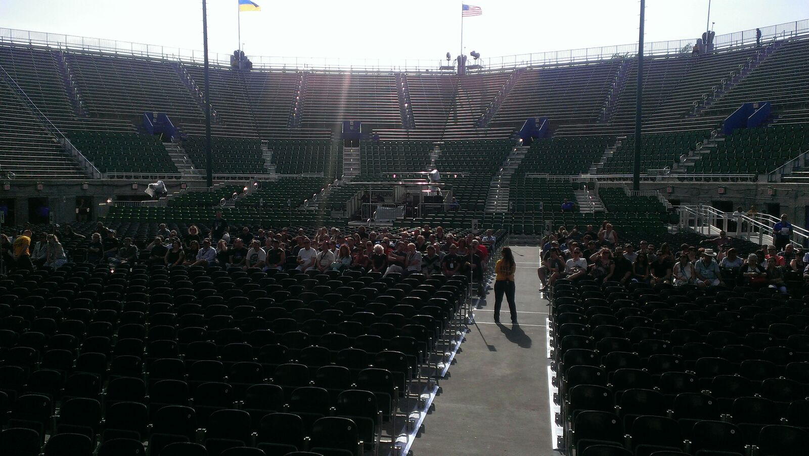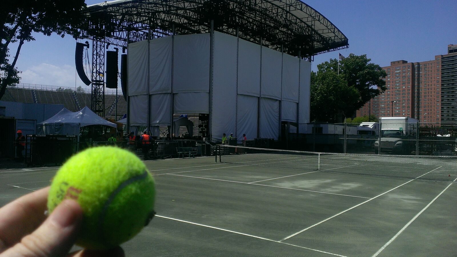 Forest Hills, NY is rather affluent, upscale suburb in Queens. It’s about 30-60 minutes from NYC, depending on how you go – and when. The location is actually a Tennis Club; a rather traditional one with clay courts and all. However, some of the amenities of a typical concert venue are not present; the backstage is a messy construction lot and the production offices and dressing rooms are housed in wooden huts, like you might find at summer camp! It was a little rough setting up, as the stage was lined on either side with immovable tents (good in some ways, harder to work our cables and sight-lines needed)