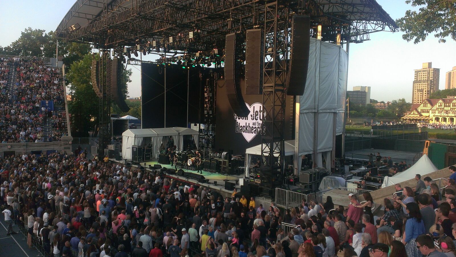 Joan and her Blackhearts did another great set, winning over many. Soon The Who followed, just as the sun was setting behind the high bleachers that surrounded the chair-covered court and the stage area. The reverse of Woodstock, where the sun rose as the band played, it had a magical feel from the light shifting. There was something special about the show, as everyone seemed to know The Who had played here back in 1971, yet Roger remembered only the rain. Many of the audience members raised their hands when asked if they’d been present at either of the two shows back then. They seemed to be truthful – at least they were the right age to have been there! Even the night before, a local Who tribute band had played the exact 1971 set in a local pub. Well done!