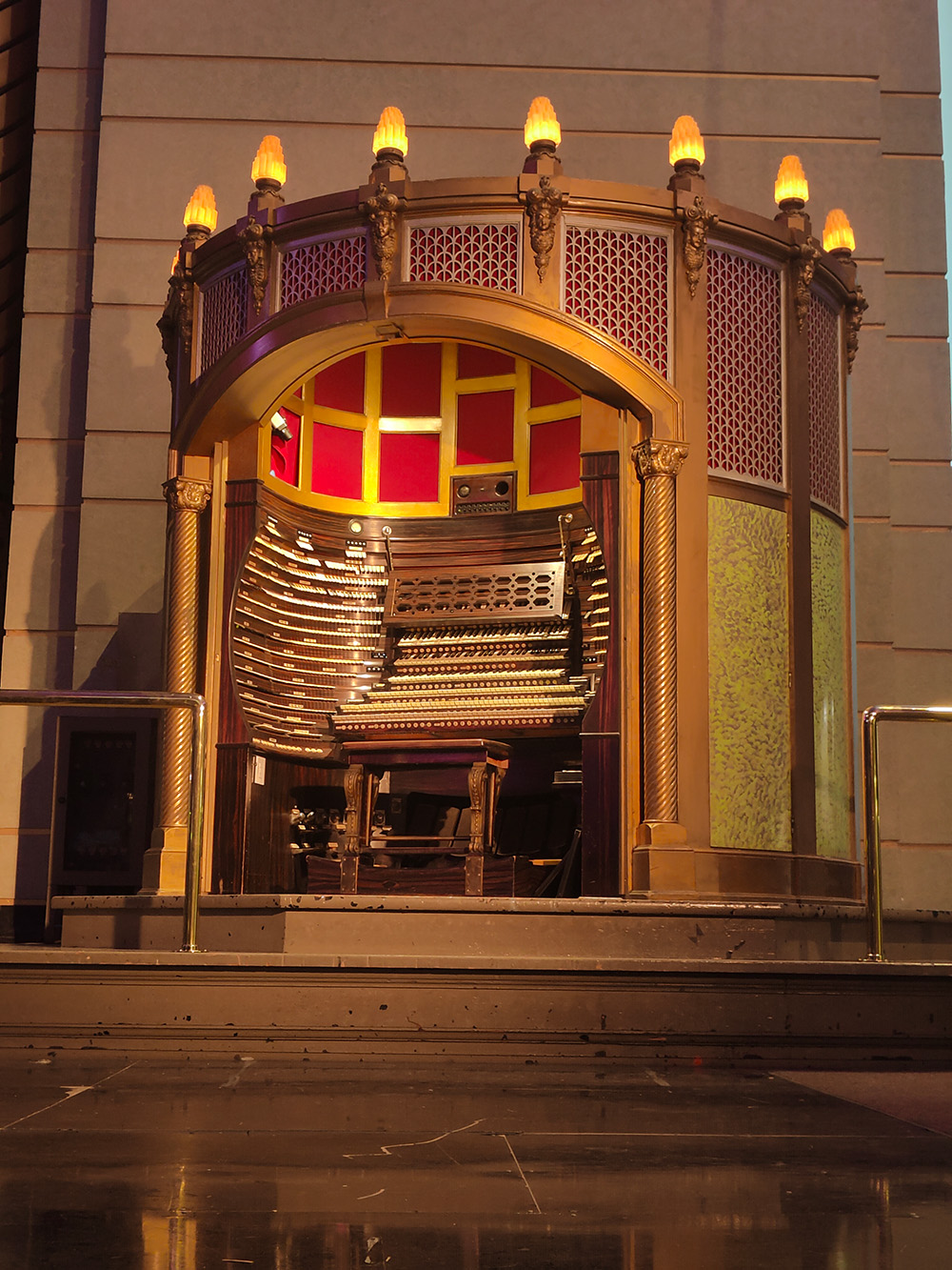 Ah, this old place. We were just here – almost. The Atlantic City, NJ show scheduled was postponed from illness, but they still sent us ahead here (on the day of the previous Philadelphia that was also cancelled) so we had three days to kill back then. Walking around the shoreline (some sand, mostly concrete), eating, gambling, movies. That’s the business here – and concerts are usually just a way to bring people here to gamble. Probably the best thing some of us did was to visit the daily free recital on the massive organ, the monster pipe organ that’s been installed here for about 100 years. It’s reputedly the largest musical instrument in the world, and certainly is the largest pipe organ ever built. So on that day off, about 20 people wandered in and saw the concert with that exceptional instrument. Look it up if you can.