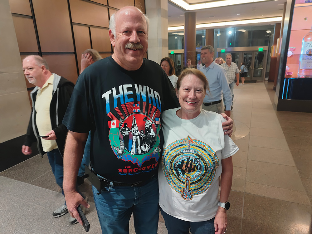 For ‘Pinball Wizard’, Pete plays the famous intro part, but Simon is on acoustic Gibson and does the core strumming bit. It was certain that the part would become an issue, as Pete was having more and more trouble with the speed of that bit on past tours, and having Simon cover the bit on acoustic leans back toward the old sound and covers the part nicely. Pete hits the big ‘duh-dun’ part (originally John’s bass) but now with Button, Gold, and himself pounding it out. Simon’s been superb on this tour, really playing well and that kind of “support team” makes it possible for us to have Who shows. (Yeah – we all know they started with just four people; that is more than half-a century ago, so not likely now.) It also add some dimension and power to have Jody on percussion – who’s physical presence is always a huge asset to any concert. I always say her playing is like adding an exclamation point to a sentence – like on that ‘Pinball Wizard’ part, it makes it SO much more powerful. And John Hogg is a great support member as well, giving doubling higher harmonies and doubling key vocal parts. Even if it’s just psychological support, we’re glad Roger chose him to come along – he’s a great guy and someday we’ll even see his musical talents on instruments.
