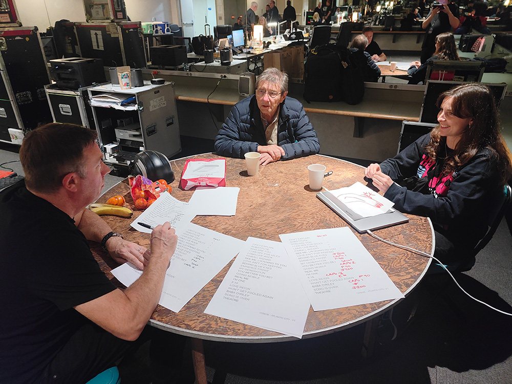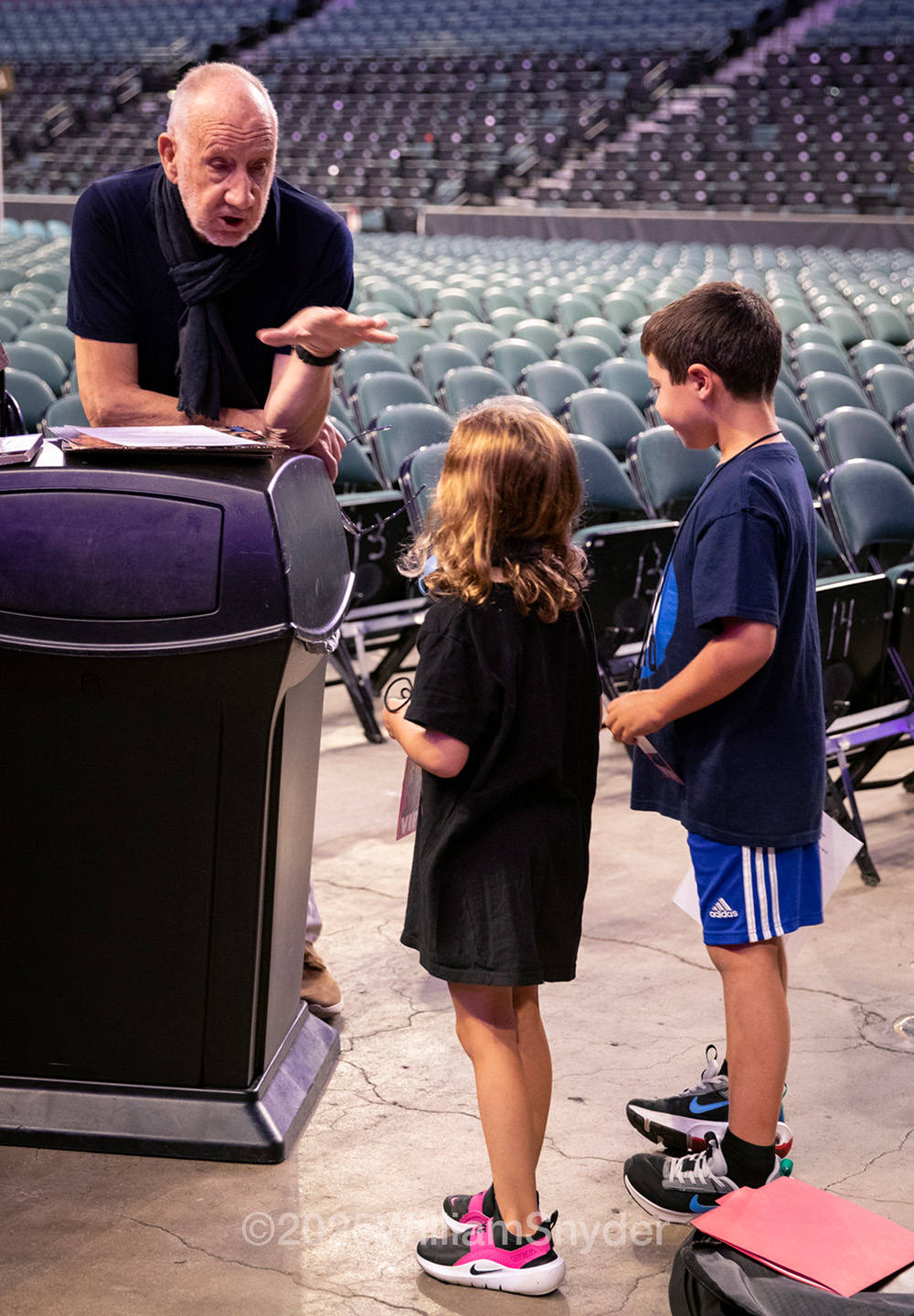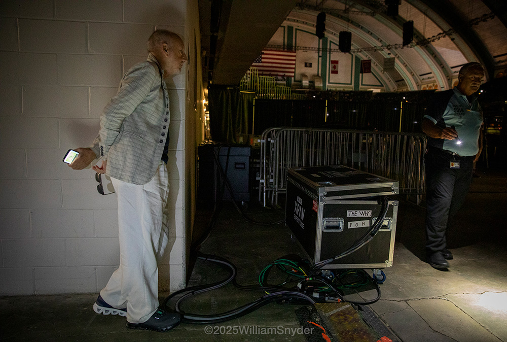 However, back in the early evening, our Who VIP’s soundcheck happened. Each day brings new situations: Loren has a new Korg keyboard, they’ve just sent it out, so a few minutes were spent comparing it to the current one, also a Korg. Loren played through some Who classics on piano. Robert, our soundman, has OK’d it at least equal to the one we have, so we may upgrade soon. Pete was here but far away in the dressing rooms. Roger wanted to start right away, so he called for a ‘Who Are You’ rehearsal. Pete’s not out yet, so Simon Law wisely doesn’t play as Pete will walk out soon, which he does. “What a dreadful place, built for elephants!” Roger seems to find the room unpleasant, despite its vintage Deco look. Not his style. The sound is very roomy, lots of echo, which can be great or not, depending on what you like/want. Pete does his famous one-note solo during ‘I Can See For Miles’, which we seem to rehearse every day, even though it’s not IN the set! Pete has recently said this is his best stage-tone ever, with a lot of slight changes like newer Lace pickups on the Fender Strats, and the Allessandro amp working alongside the Fender. We run through ‘You Better You Bet’ at Roger’s request – he’s been having trouble following the track with the band noises, so that’s done and adjusted. During the run-through, Pete’s guitar cuts out briefly, but Simon Law sorts it out. Better to have these issues at soundcheck than the show! At the end, Roger tells the small crowd “Thank you for supporting us, see you later, I’m off to bed!” Pete realizes he’s not said a word; “Thank you from me, too. Thanks for coming.”