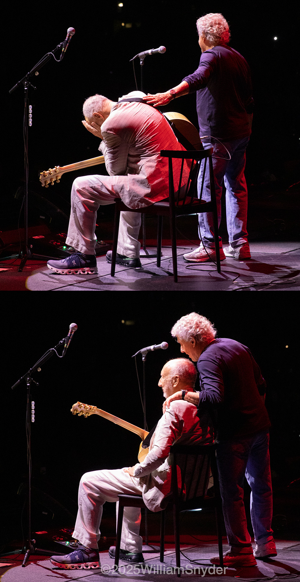 The show: Our opening film is a new thing this year. It’s a series of vintage-looking words on the screen, matching audio from old interviews of The Ox, Pete and Rog, etc sort of detailing their first arrival on these shores back in 1967. The Murray the K shows in NYC, Monterey Pop Festival in, um . . . Monterey! The backing band sneak onstage in the dark during this, and Pete and Roger take their sweet time coming out when it ends; not really the ideal timing as the cheers start to die down after the film ends, but it is what it is – they’re used to coming on casually, rather than a big Michael Jackson dramatic entrance. Casual is cool. But – Pete senses their slowness and walks up to the microphone… “Nag, nag, nag, nag, nag!!” and laughs at their lateness. He mentions flying in today and seeing the beautiful waterways and greenery (not here on the gambling front) and says if you’re from here you’re very lucky.
