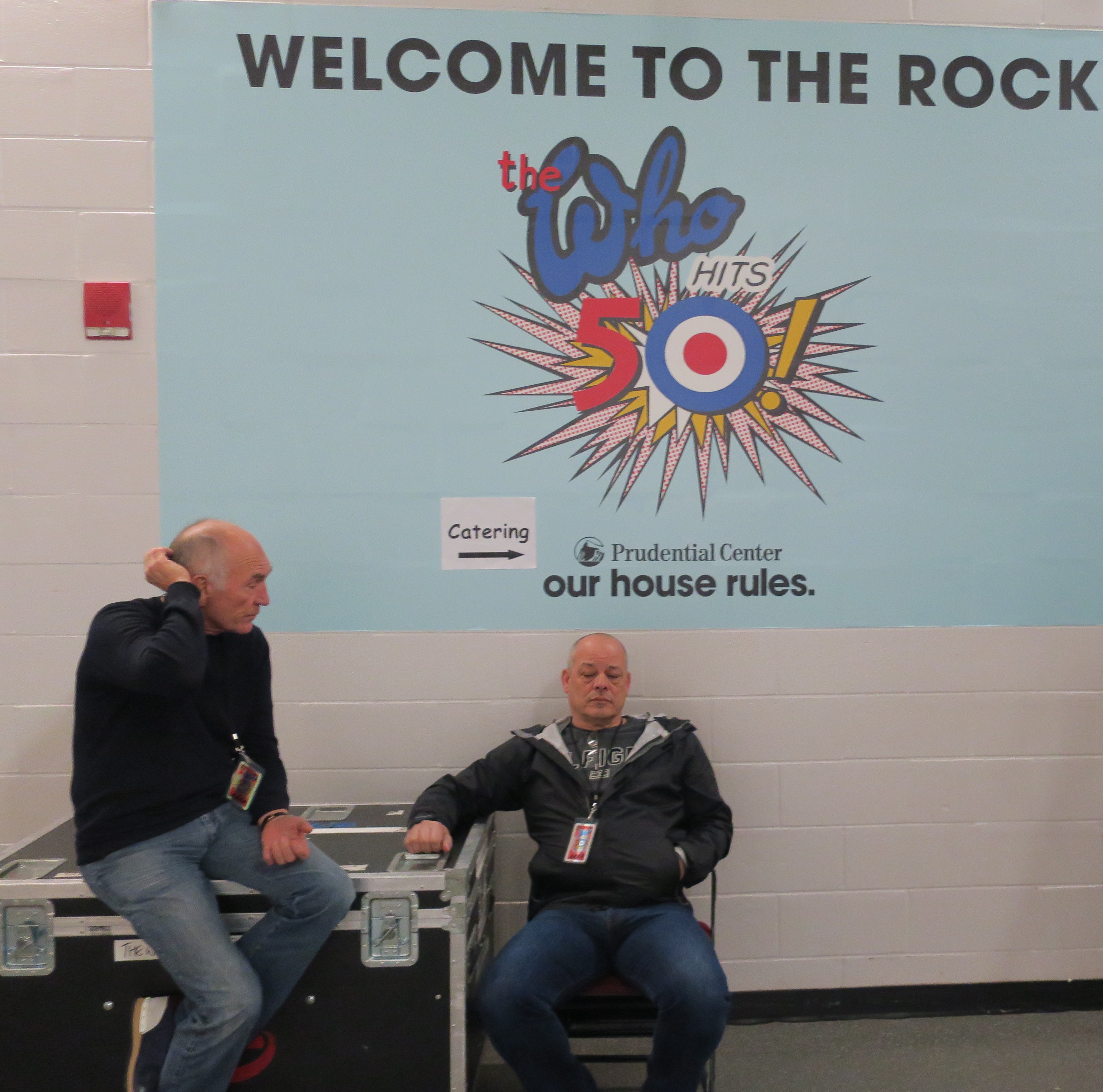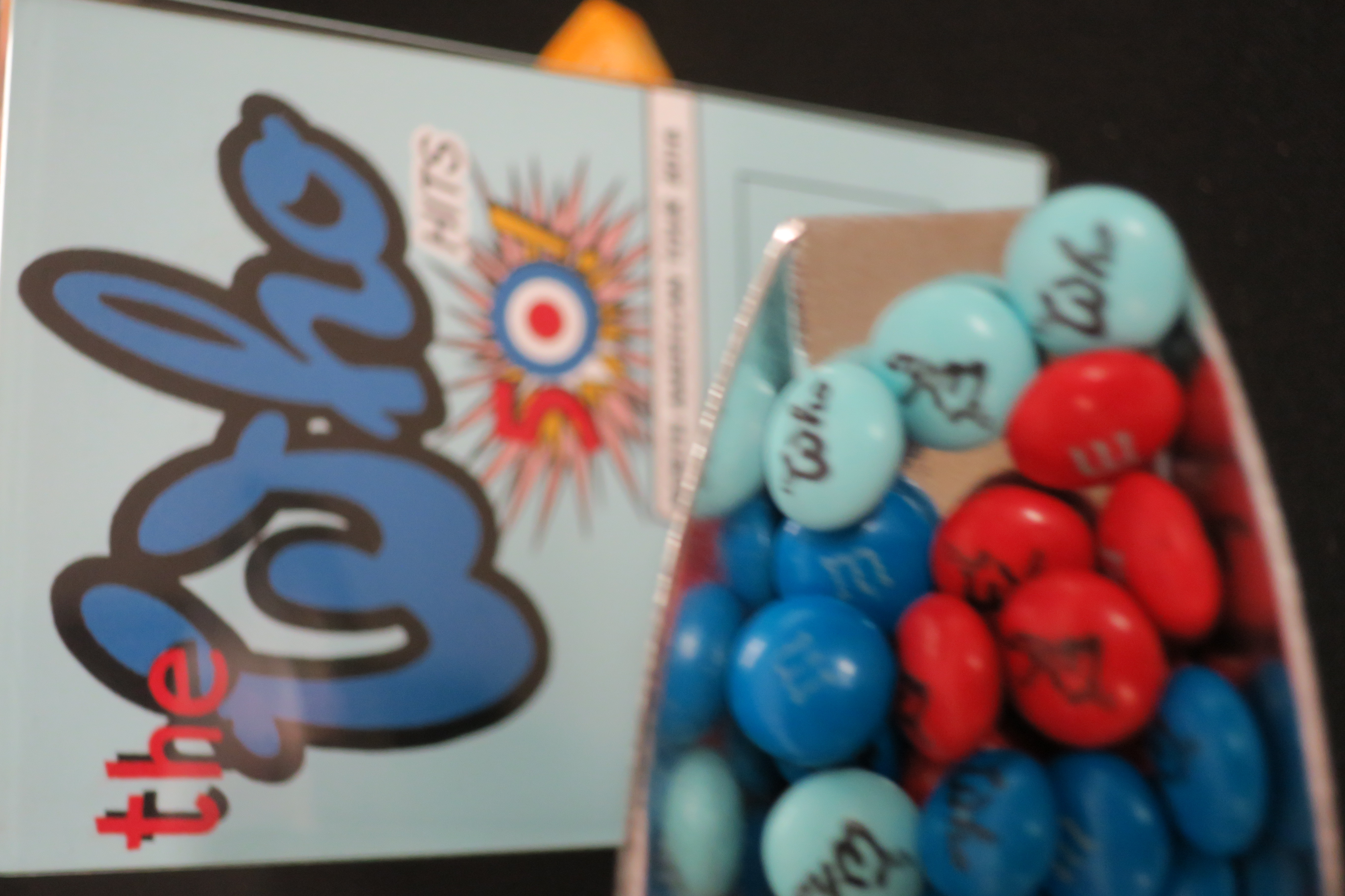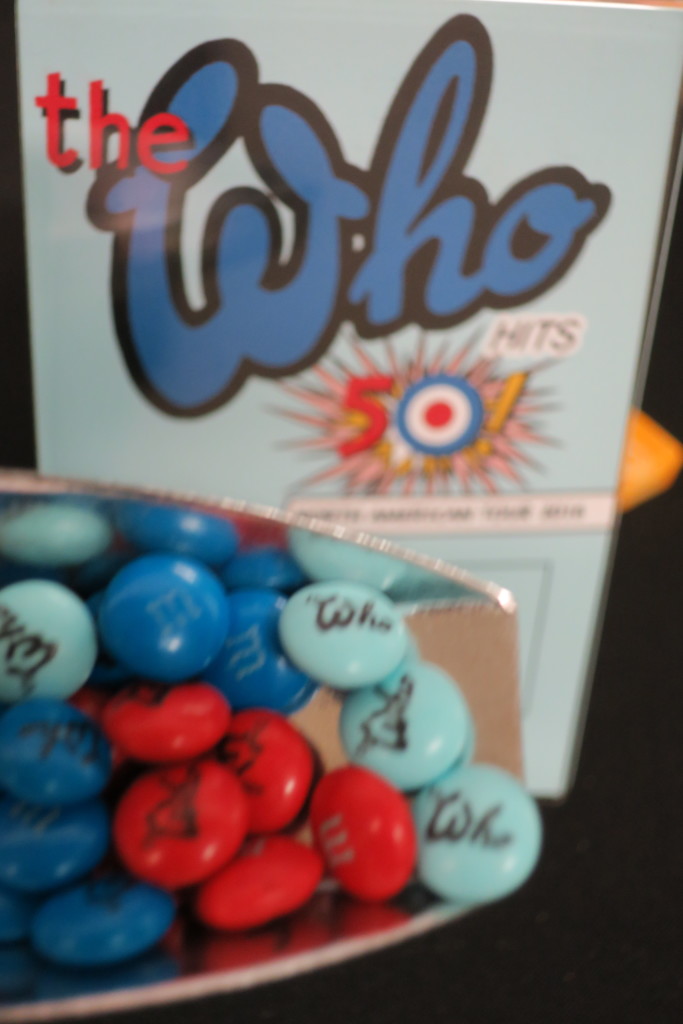 Newark, New Jersey. It’s only across the water from NYC, so a lot of people have come here from there, or the boroughs or other parts of the area. The Who haven’t played here much, in Newark, aside from one previous recent show and Roger’s solo tour. Small things matter: We were very excited to see custom M&Ms backstage with a Who logo on them; we know it’s possible, but rare to see! This show was literally packed to the rafters; they’d even moved the stage back several feet this morning, to accommodate a few extra rows on the floor – which sold out very quickly. Hint for concert-goers anywhere: shows usually hold back a few seats that only go on sale the day of the show. Some are held so that the placement of the sound and light boards in the middle of the arena have room. Others on the sides near the stage are held until we can determine what sight-lines are blocked by the hanging sound system and lights: once in-the-clear; those seats go on sale the day of the show, usually mid-afternoon. This is true not only for the Who, but for most touring shows anywhere.)