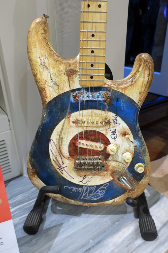 Fascinating to see a group outing to meet and spend time with boxing legend Sugar Ray Leonard who was there (nice guy too). Ray boosted his own auction from the stage, offering for an extra $10k that he would hit someone so they could “see how it feels” – and it got a bid! (Also stay tuned for TCA auction of the nearly one-of-a-kind early Who memorabilia we were given during this tour.) An artist Jamie Durrant print rendering of ‘The Acid Queen’ (the chrome coffin mentioned here before a week or so ago) which was quite nicely done. There was a signed Fender Stratocaster, with an aged roundel theme: This was signed by Pete, Eddie Vedder, Joan Jett, Rick Nielsen and Joe Walsh at our charity event last year. Some serious rock names – credible, and all wonderful people.