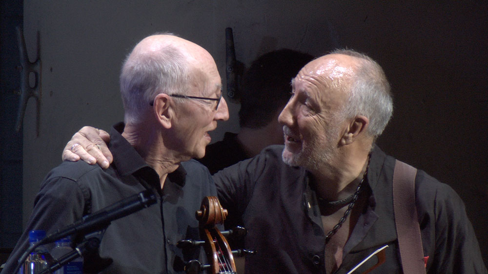 And tonight, it went further: Pete mentioned that the 25th Anniversary tour was almost a three-hour show, so they took an intermission during the show, which was “weird.” But then Roger proclaimed, “we’re going to play TEN HOURS tonight” (to huge cheers!) “Serves you F-ing right!!” he said. “Sounds like a solo show,” Pete replied. Then Pete countered with some solo show he’d done at Jones Beach outside NYC, where he played about three and a quarter hours! He talked about Springsteen and those who do that – and how unthinkable it is now. There was talk of the South American shows we did with Guns N Roses; how they loved the guys, but the GnR show was over three hours long (and mostly consisted of Slash guitar solos, they joked.)