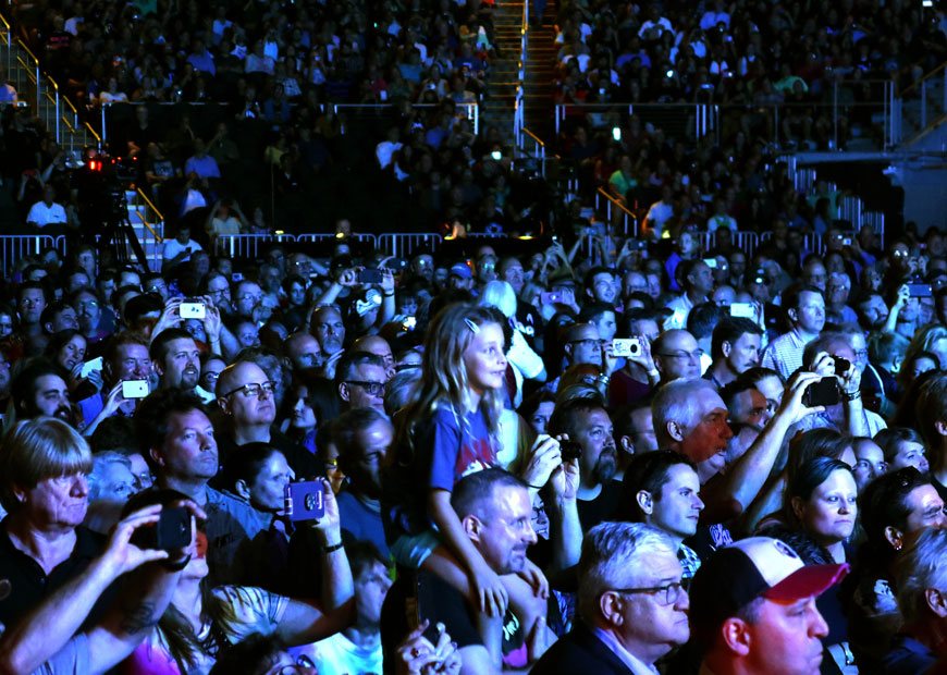 Further pushing the timeline joke, he asked about people born after 1967, then stated that “we only want fresh fans – who know how to work a f***ing laptop!!” As it happens, we noticed a lot of young people here tonight. From a very young girl sitting on her father’s shoulders in the third or fourth row during ‘Who Are You’ – wearing her own Who t-shirt and singing along to the catchy chorus. I met a mother and her two kids outside taking photos by our signs, one of many multi-generational layers we see today. Yeah, the usual people are here from expected age and gender groups. But the change is always cool – when those in the YouTube generation discover a great group that is timeless and visually stunning in performance. We’re also seeing a greater number of those in their 20s and 30s; too young to have been around for original album releases, but without any nostalgia, have become big Who fans.