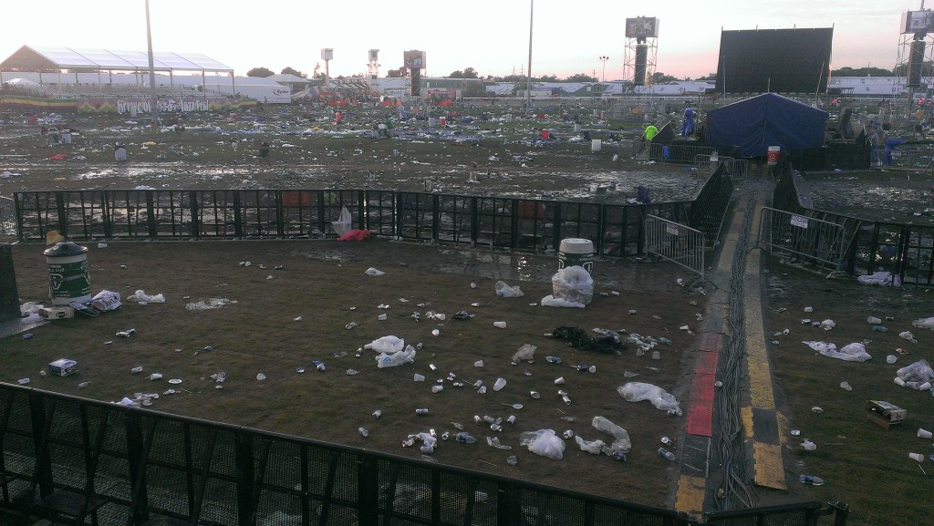 Not to say it was easy. This was a rough one. The crew loaded in most of the equipment late the night before, but were not allowed to make noise and were cut off long before completion due to curfews. All of which required an early morning return at dawn to complete the set up. We’d seen hard rain and wind the day before, so we moved our equipment back on the stage to leave room for other bands but covered everything in plastic to prevent coming rain damage. Only a few hours later, huge rains and wind darkened the sky, forcing one band to cancel mid-show. The extreme wind caused us to reinforce and rework the rain protection. The front of stage was fully soaked, with cables in an inch of standing water toward the front of the stage. Local hands swept water away as it was discussed whether to stop the shows or not; yet, as it was predicted, the rain would abate before The Who set, we were promised.