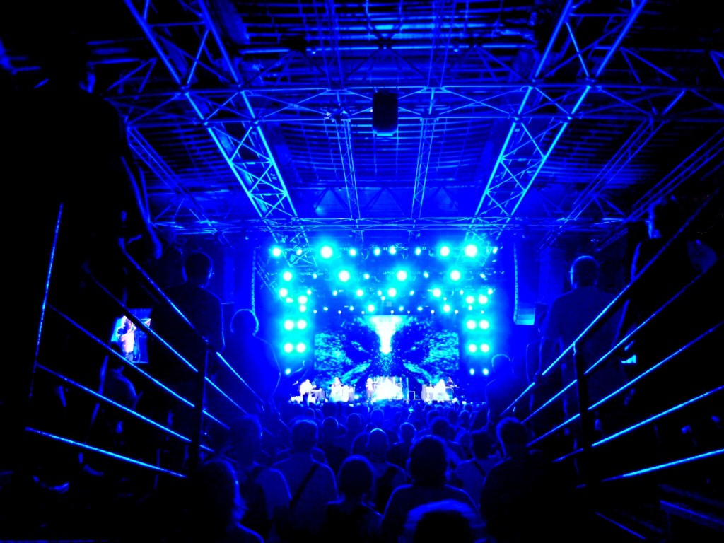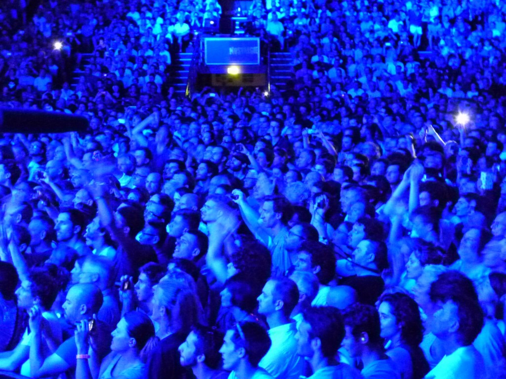 All’s well that ends well, and this one ended WELL. I ran out to the crowd to shoot a few final photos and got probably my best photo of the tour: Coming out underneath the bleacher sets toward the stage, I stopped in the “tunnel” to the floor and caught the stage, lights, roof, audience, and structure all in one shot. A great look.