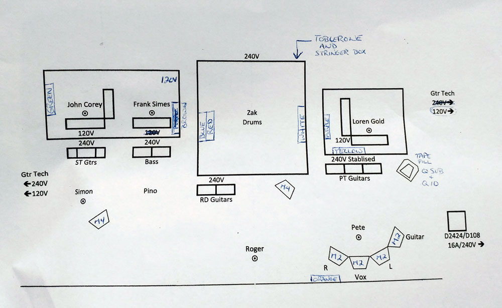 Another new hire is Simon Law, joining us to take care of Pete’s amps and pedal systems. Simon’s replacing Tim Myer, who’s gone back to his longterm employer (Roger Waters) on that huge world tour. Tim is more than busy with them, and also gets to serve champagne onstage wearing a pig mask, which we have yet to offer ANY crew member. Simon Law’s getting up to speed quickly, having “looked in” on the job while we were last working the UK. He’s coming from a strong background of many things, like guitar building, and tech work for Robben Ford, Matt Schofield, and many others.