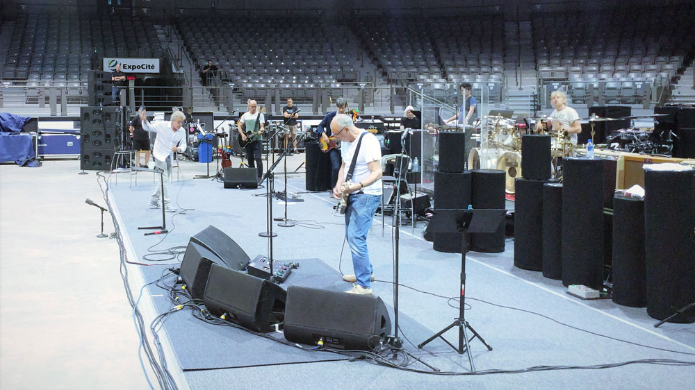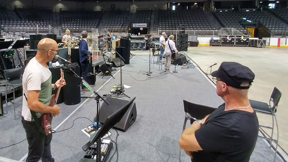 The crew gathered first, arriving alongside the trucks of equipment. Some is exactly the same; guitars, drums, etc.) and others are equivalent versions of things that are hired/rented for each leg (the PA system, mixing boards, screens.) Same for the people, most are the same, with some of the crew going back to the ’70s now (with Bob Pridden no longer present from the ’60s) and some are brand-new, joining us for this leg or for years more, depending.