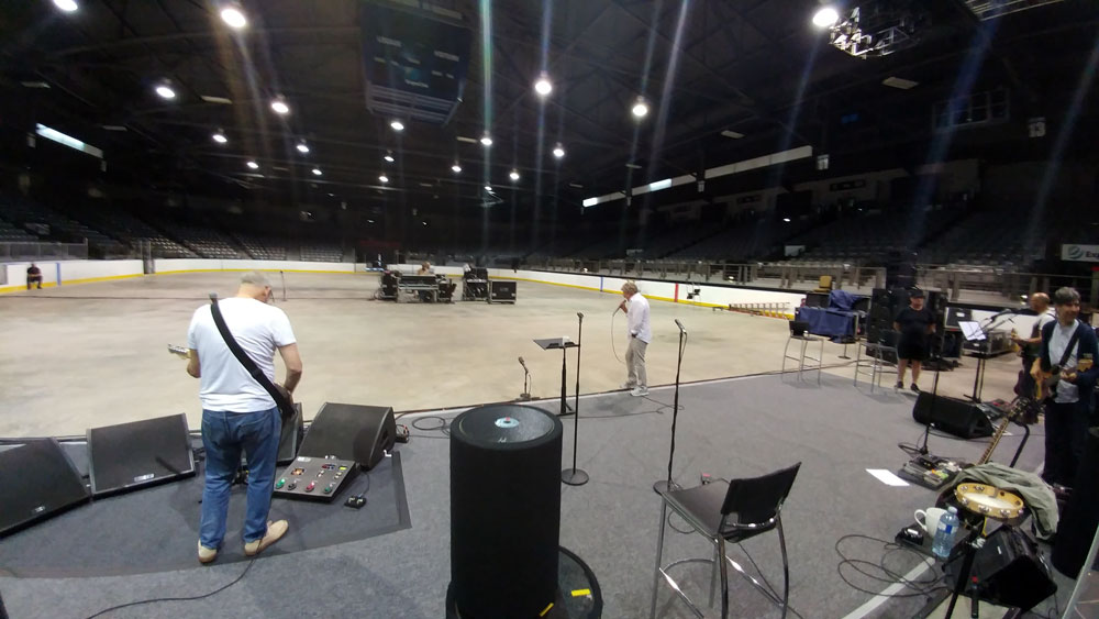 We set up the first day, and very few problems arose. The venue is an empty hockey arena (they have those around here) and will be used to test the equipment and band members before we hit the big stage on Thursday. It’s been a good break, but we’re all prepped to go!