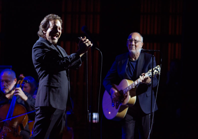 Tonight, the special guest is Eddie Vedder. No doubt, MANY of the fans here came out to support this local hero, and their shirts and voices showed Ed is their man. We don’t mind, as he brings so much help and attention to Roger and Pete’s TCT/TCA charity. Besides, he’s one of the kindest, most-honest and open people you will meet in rock. All of us look forward to seeing him, and new people along – like Alfie Boe – are just discovering what a sincere and supportive guy Ed is.