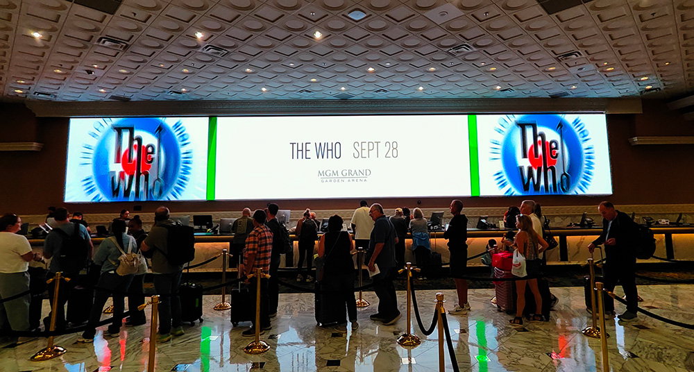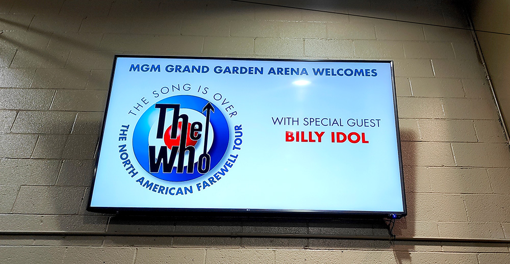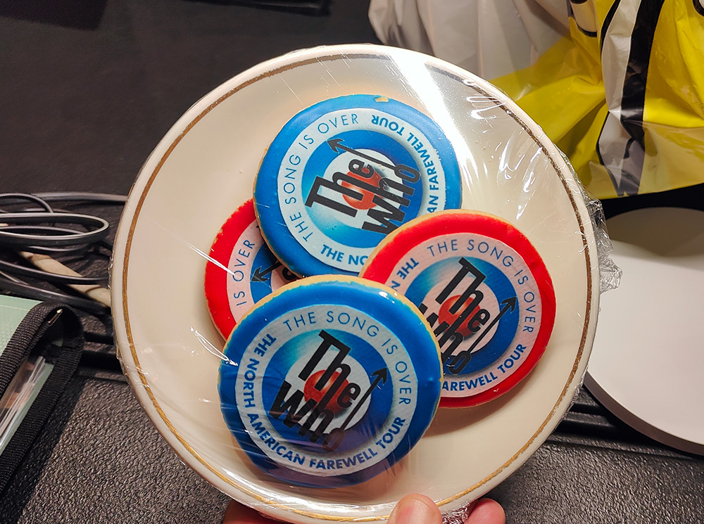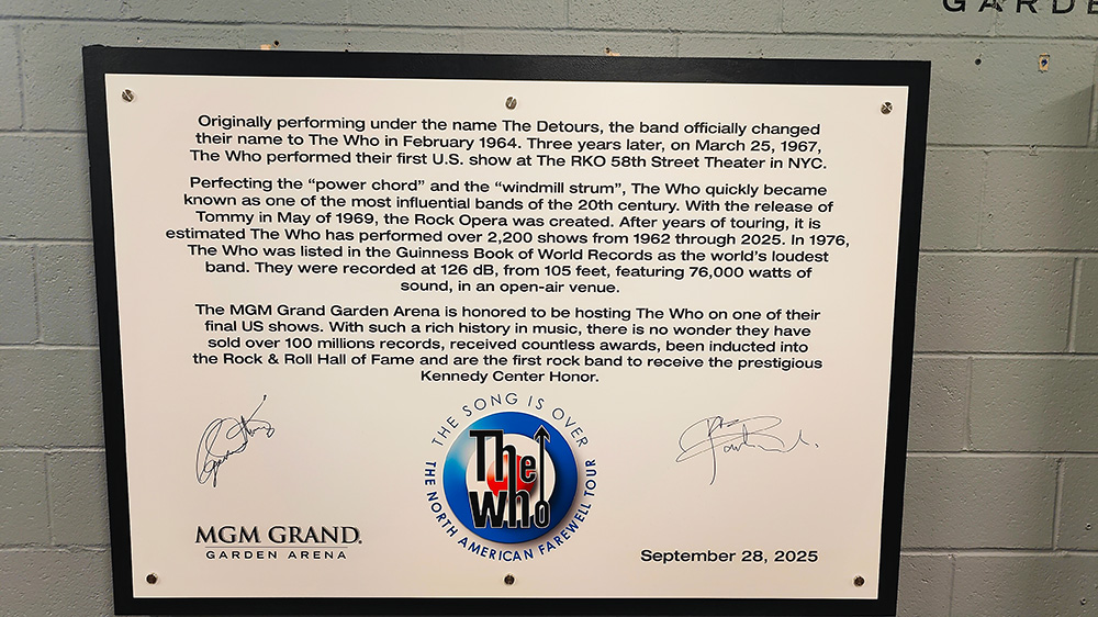 Backstage before the show, they really have done up the place, not just with the usual signage of who’s on tonight, but cookies, doorways covered in Who photos, all kinds of neat attention to detail. Mostly impressive is the unveiling of a new poster-sized plaque in the artists’ hallway: It celebrates the band coming to the MGM Garden Arena with a nice story of the group etc etc. Pete and Roger signed this on their way to the stage. There are dozens of posters and photos of other impressive groups in the hallway here, but this is something quite extra.