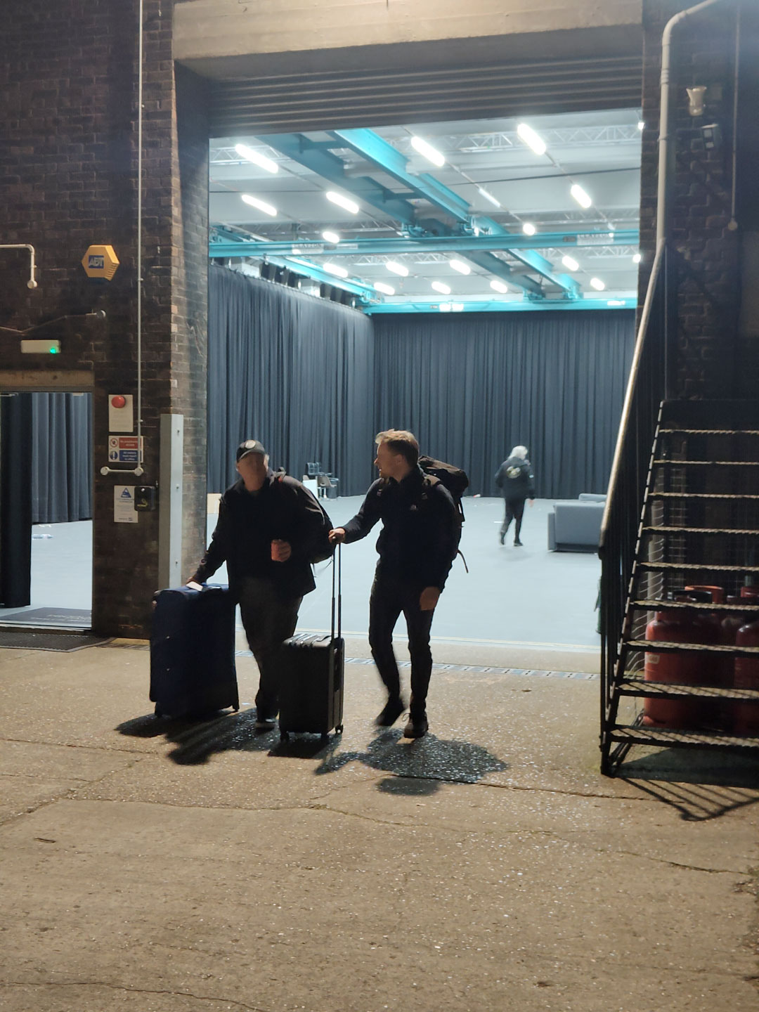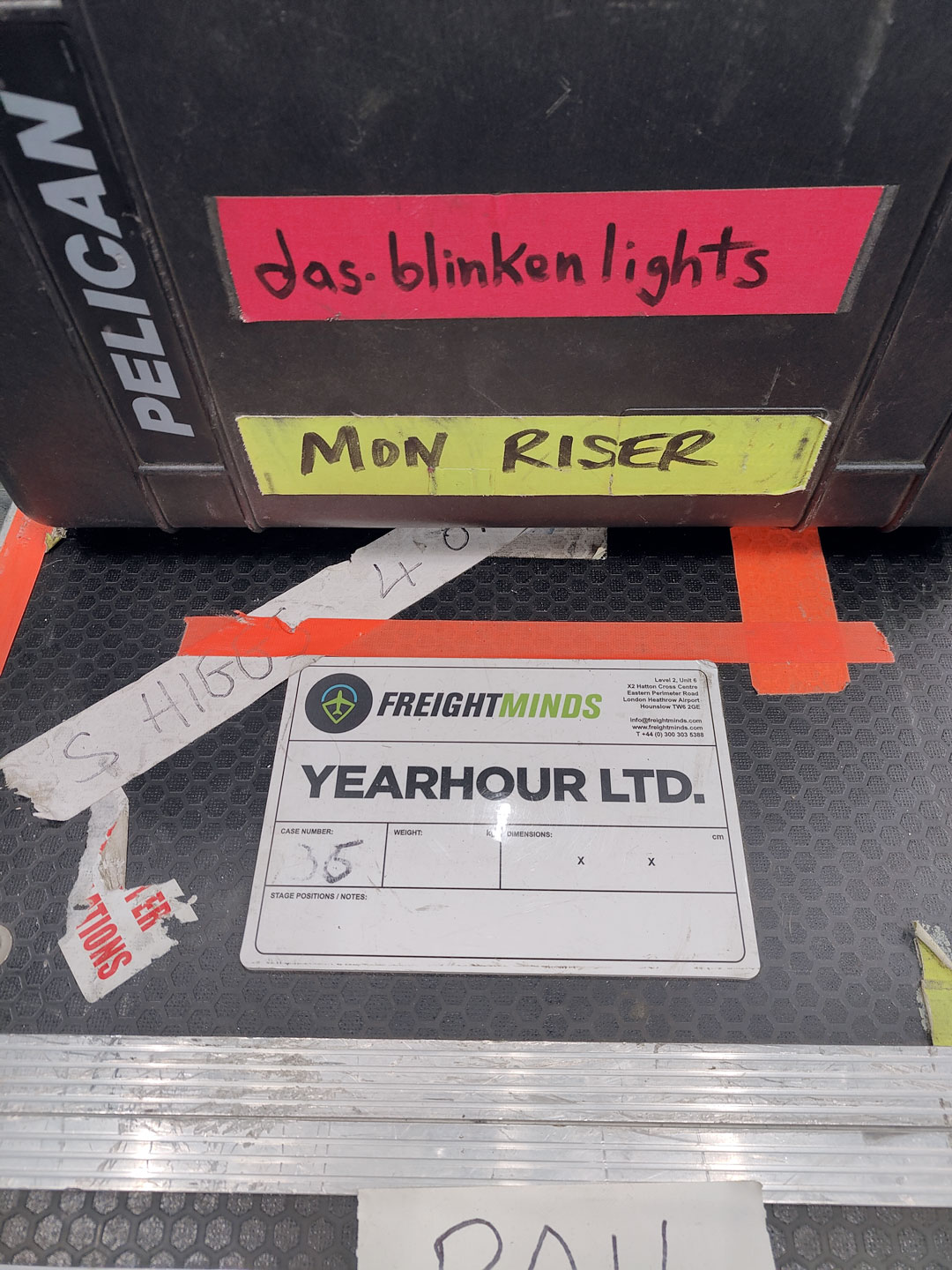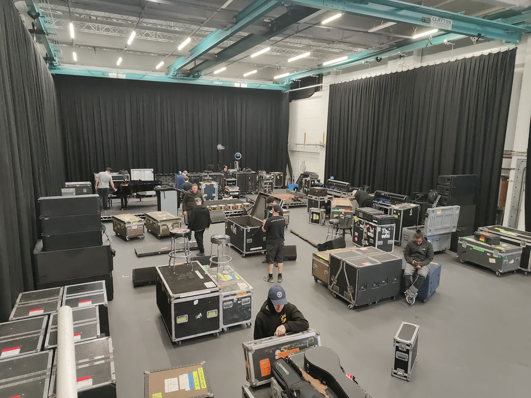 We were in this new location, basically a big warehouse with huge curtains around to knock down the sound a bit. The first day (Thursday) was “tech day” – where the crew work to set up and wire everything, fix and clean whatever’s been in storage for a year, things like that. It’s good – and needed – to have this time. Some tours, the time/money crunch means we have to do it on the same day that the band will be coming in – so much more of a rush and things never get done properly on those days. But there’s a lot riding on these particular shows being good, so we were given the time to do things as well as possible. As always, our team is good, hard-working, and funny. Good to be back.