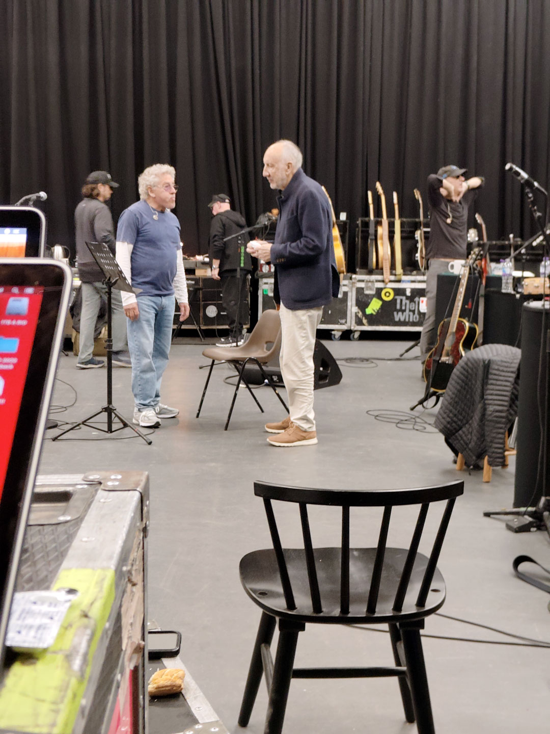 Next, our big situation: Roger’s been doing very well with his solo tours, and has another coming up soon. There hasn’t been any Who touring planned, but these two shows for charity will be a “test bed” to see if things for the Who v6.7 will be any good. Will we have more shows like this, sans orchestra, at 80+ years for Rog and Pete? By our second rehearsal, Pete is ripping on guitar, the sound is back, it makes him comfortable, and things are sounding very solid. We run through quite a few of the classics with Jon Hogg singing lead in Roger’s place when possible – he’s stunningly great. Yes, it’s a bit rusty here and there, but this is always the case after any break.