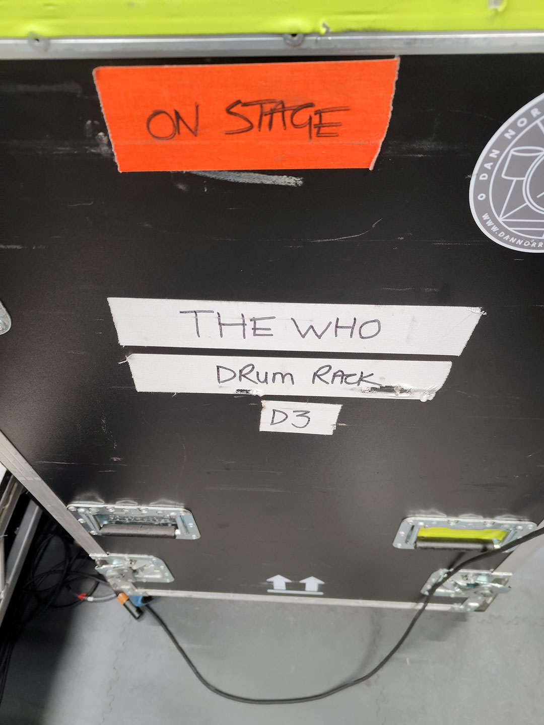 We have had sound issues for Roger, and our longtime monitors man (Simon Higgs) is gone, so we have instead John Switzer, who’s been on our sound crew for years; He’s been doing monitors on Roger’s solo tour (admittedly a different band, but the concepts are the same.) Switzer is young, eager, and doing well so far in what is usually the toughest role in the crew, the onstage sound mix. Some of our pre-Roger rehearsal was to get the stage volume down so Roger can have a clearer choice of blends in his “ears” – the earbud monitors most musicians use. Pete and Robert Collins try to understand how the sound in the audience bounces back and affects what Roger is hearing, trying to keep it clear and balanced; it’s a tricky game, because it all mixes together in different ways, in different rooms, on different parts of the stage. Pete is the only one who doesn’t use the in-ear monitors; he uses the “wedges” slanted speaker boxes that sit onstage. I may have told you about his setup, which IS unique to him, and quite brilliant. He stands in the middle of a box of four wedge monitors. In the two speakers in front of him, he hears his and the band’s vocals, plus his own acoustic guitar signal. Behind him on the left, is the playback of the tracks like ‘Baba O’Riley’ and ‘Won’t Get Fooled Again’ – his own synth/organ tapes from countless Who shows. And in the rear/right monitor speaker (between himself and the drums) he has the sound of the drums and bass, so when he’s looking at Zak, he hears the drums from that same direction. During rehearsals this weekend, Roger kept hearing “too much drums” despite the lack of any REAL drums onstage (Zak’s pads are rubber/plastic and don’t really make much noise.) Eventually it was determined that Rog was hearing too much of Pete’s rear/right wedge, which is somewhat near him. But Pete needs the drums/bass to drive him, always. We did a lot of moving things and baffles so the drum speaker can still be loud enough for Pete, but it blocks any sound of that speaker from Roger, who has his own drum mix. These are significant changes that won’t be noticible by anyone watching the show, but it may make a huge difference in the feeling and outcome for the musicians onstage. This is why we rehearse!