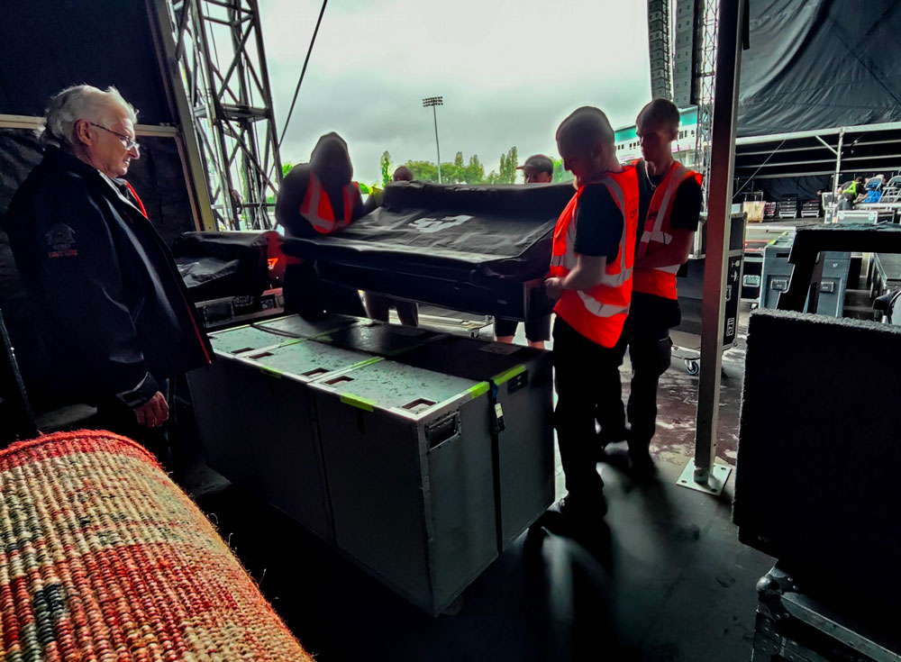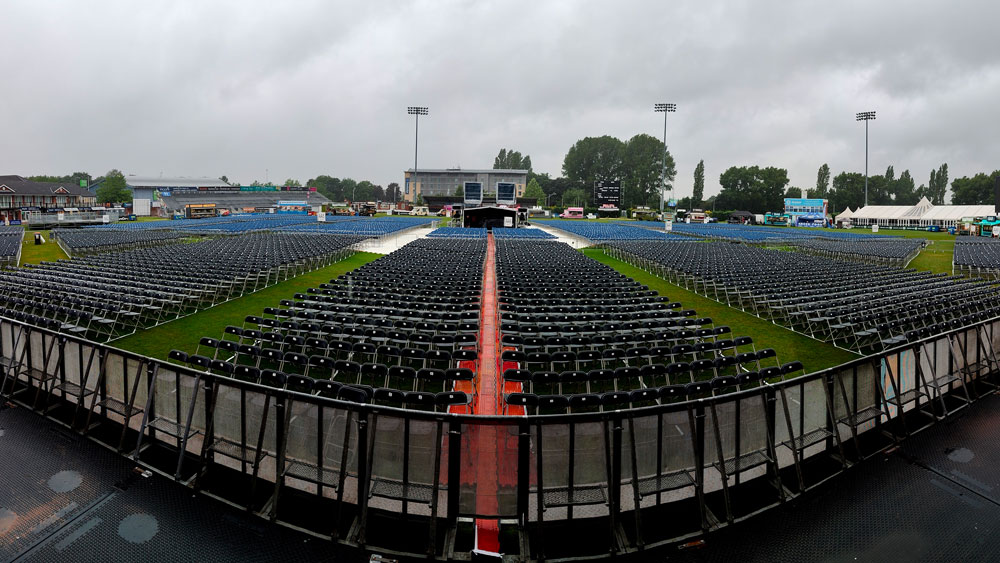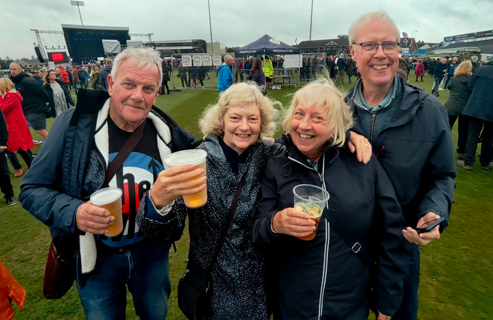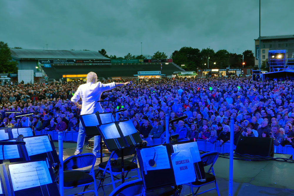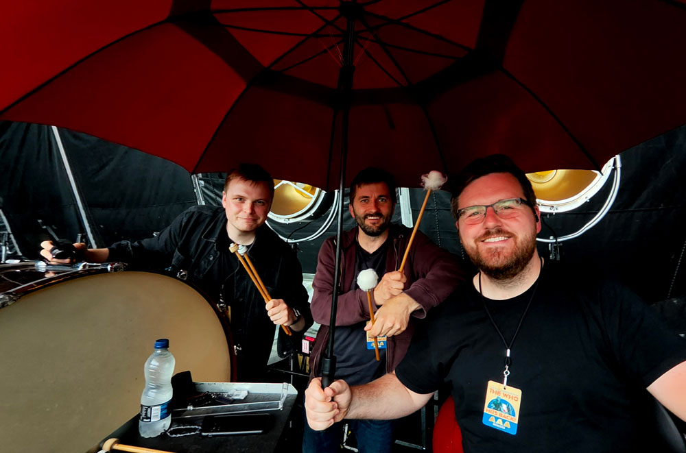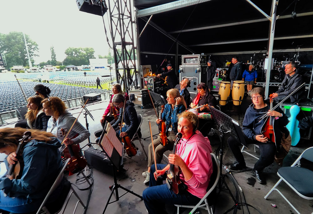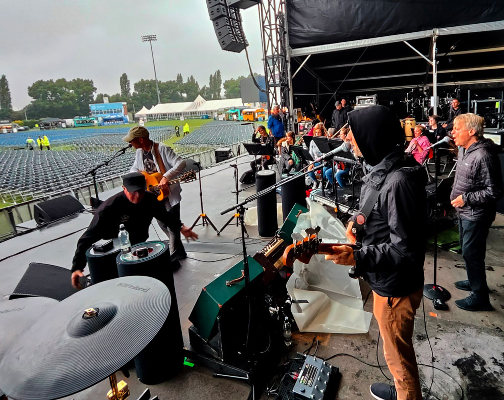 We came from the hustle and bustle of intense London, a hub of modernism and progress, a modern indoor arena, and dry all day. Not here, in Derby. We’re playing in a cricket ground, probably the kind of place you might see the original Who in 1964 or ’65. Sure, the stage is MUCH bigger than those early days; it’s huge (and we have an orchestra). But it’s the same kind of countryside scene and crowds who roll in from various external towns and villages, some locals, of course.