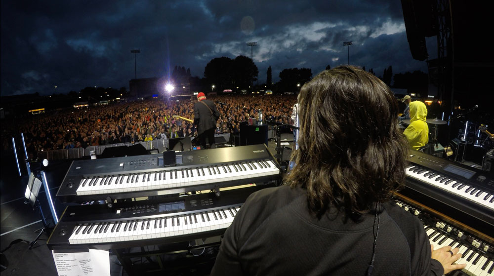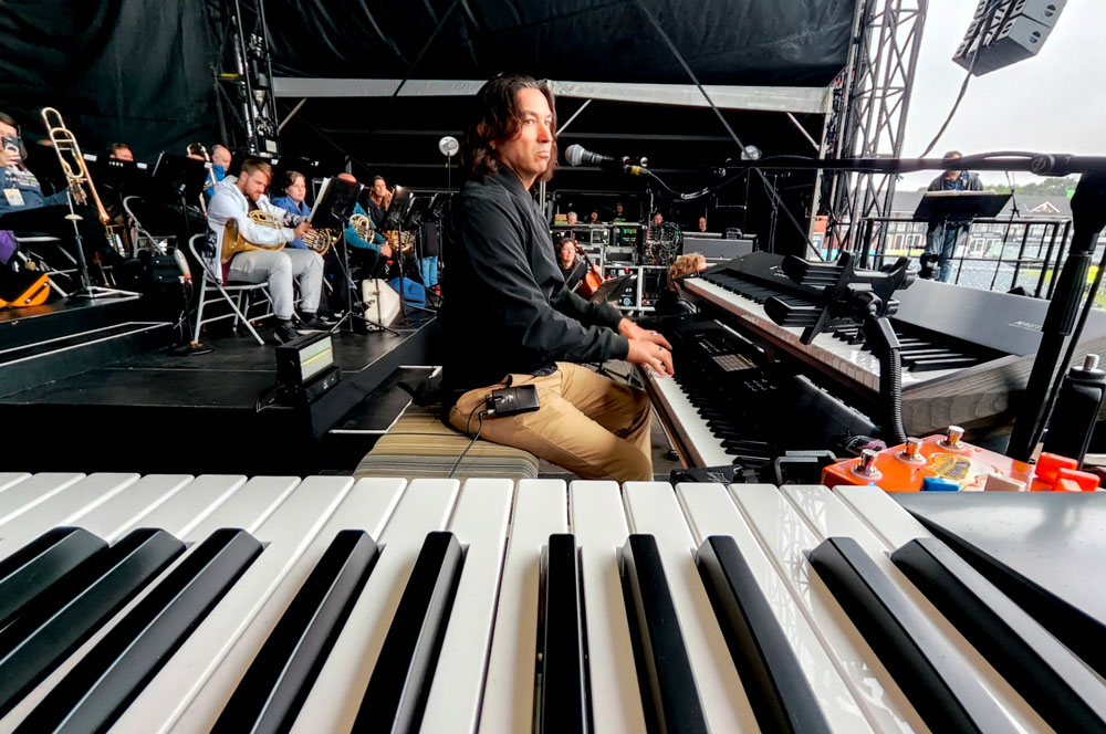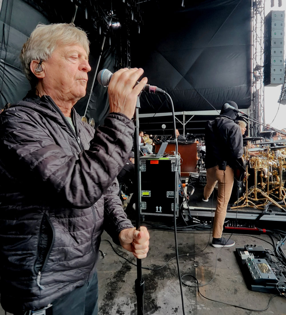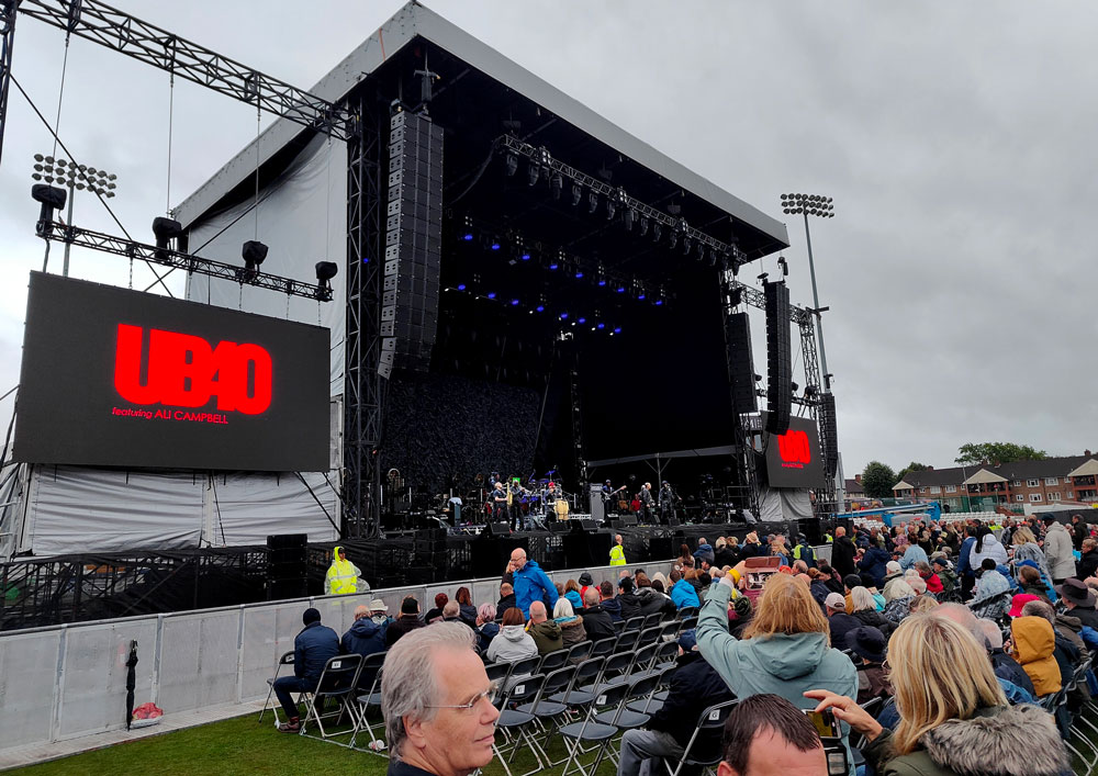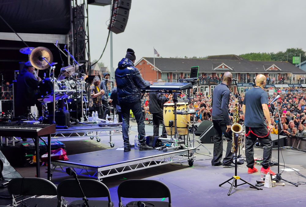 Isabella Coulstock is opening the show again, solo acoustic guitar and voice. It’s quieter stuff, but she’s still well-received. And then another strong musical entity: UB40 featuring Ali Campbell! They’ve done one show with us before, in Hull, but I didn’t have time to get into that part. Their classic sound is well-known and equally well-liked by everyone here. They do a smart set of their classics, but also do some great UB40-style covers, like ‘Purple Rain’! People do seem to love it, it’s easy, has some of that reggae/Mod flavour that ties into the old Who culture. Their management is shared with The Who, so we’re happy to give them stage time in front of this crowd that may not normally see them. From the stage there are already thousands here, dancing under the evening sky (it doesn’t set until quite late here) and generally enjoying the evening out.
