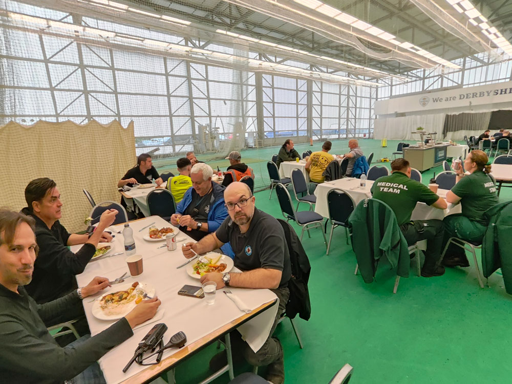 Our crew’s hotel is right next to the cricket ground, literally upon it. As you’ll see in one of the first photos from my rooms window, I can see them setting things up the day before. When morning rolls around we can walk across to the event. Everywhere there are sports signs and settings, even nets around the area they’ve designated as our catering/meal room. And the dressing rooms are locker rooms – although that’s also pretty common in arenas we play everywhere.