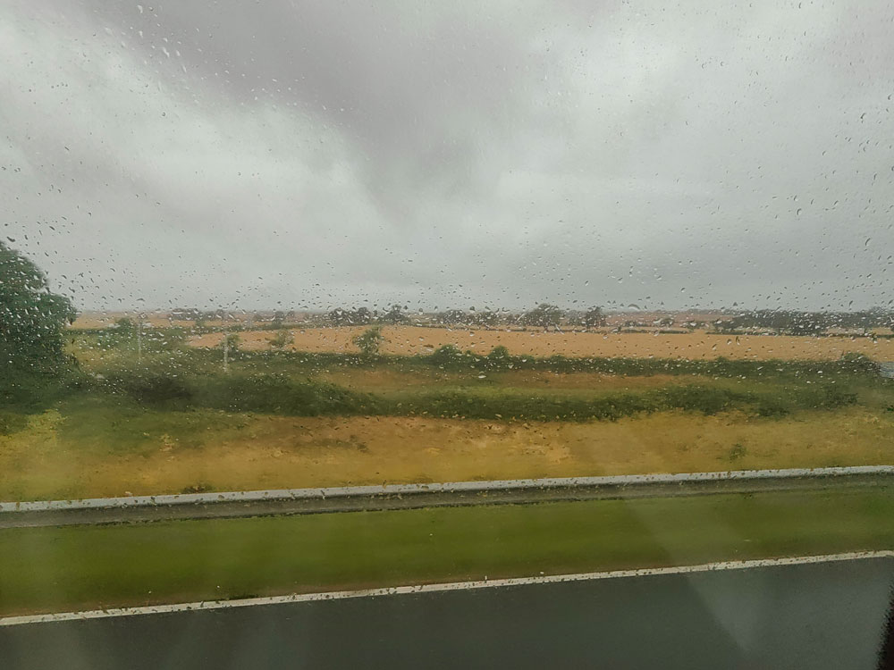 It’s a big stage, but weather is threatening. And midway through the day, just after the crew sets up all the gear – the rain drops HARD. So much so that even the leak-proof tent was leaking, and we raced to cover all our instruments and amps with tarps. Done, now we only have about six hours to wait for our show, and it will continue to rain off and on for hours. The rest of the world is burning up, totally unbearable heat elsewhere, but we get the opposite! (Thanks to some of our crew, the lights/video/sound are largely in place from the day before. They’ve been doing this a lot, “advancing” in before show day to prep and get the bigger, heavier things into place. Makes it a lot easier for the rest of us.)