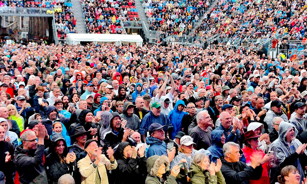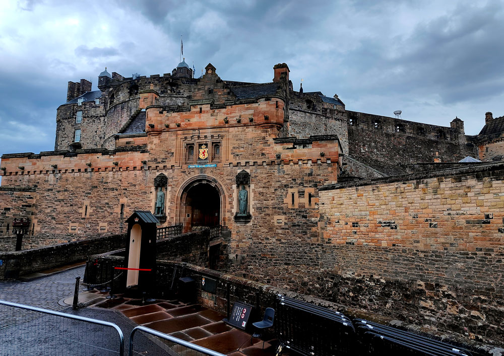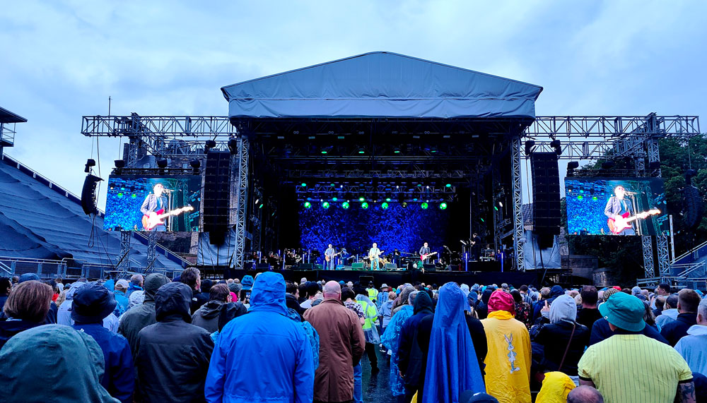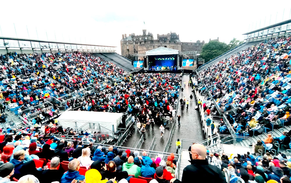 Well, here we are back in cloudy Scotland, very appropriate weather for this special situation. The city is quite old, very picturesque and worth a visit. Yes, it’s touristy, but in a good way – lots of whisky shops, kilts and tartans everywhere. But it’s absolutely welcoming and comfortable, something to see on every block. We’re playing at a most unusual venue. Each summer, the city of Edinburgh spend about two months building a large concert venue on the Castle Rock hill overlooking the city. At the very top of the hill is the legendary castle, the seat of power of Scotland for many centuries. And it’s not one of those smaller castles that dot the hills around the UK and Europe – this one is a monster.