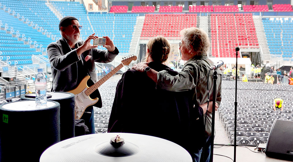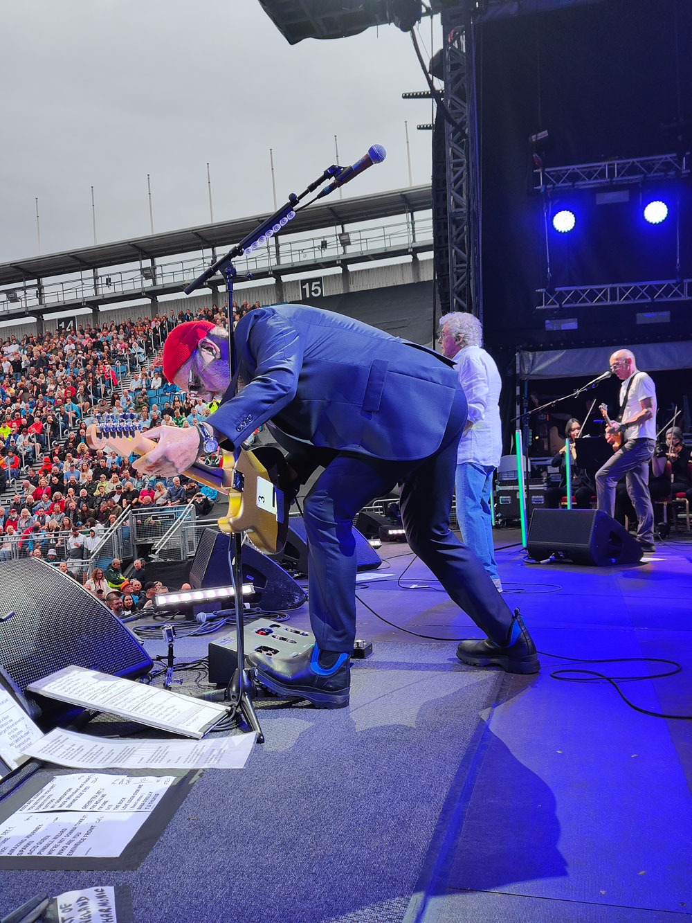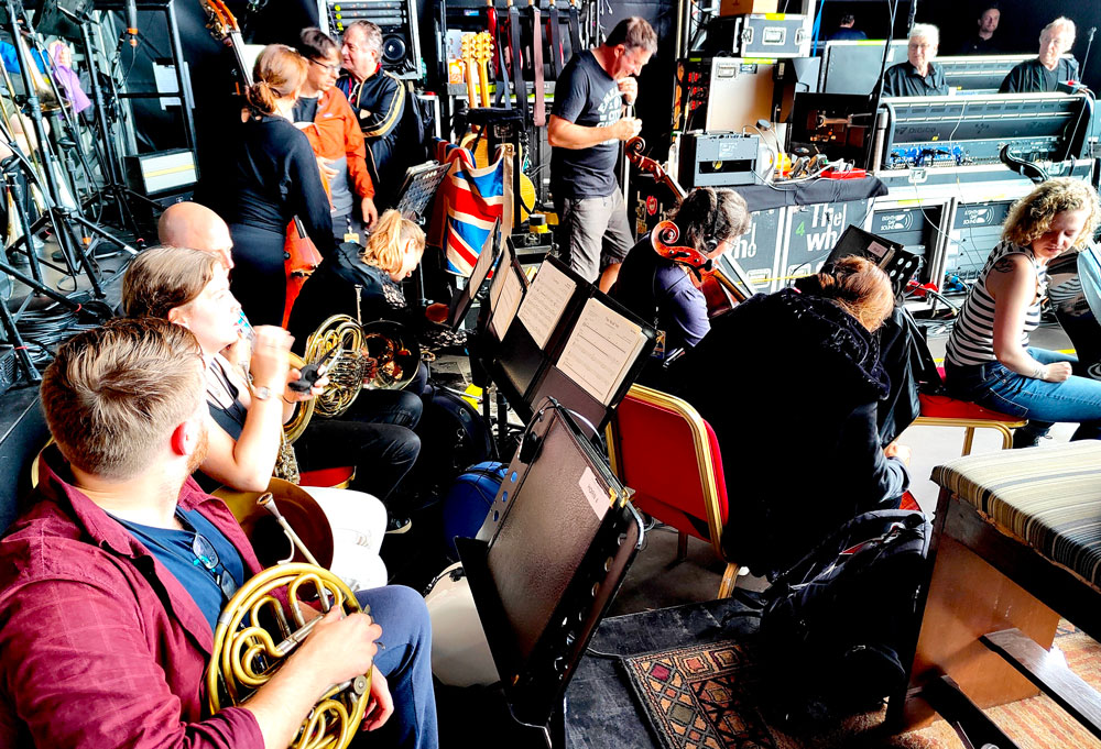Since we don’t have room for a big opening act, we have a special offer: our own Simon Townshend! He’s doing a solo show. Simon’s been prepping for ages, adding all new tricks to his arsenal, including looper pedals that repeat parts over and over, rhythm machines, bass pedals, harmony boxes. Using these he can play with bass parts, rhythms and even have harmony voices singing along with himself live. It’s a pretty cool bag of tricks. He’s doing a lot to keep people entertained out there. Then – it’s time to go – and we fill the stage with The ‘Oo and their orchestra.