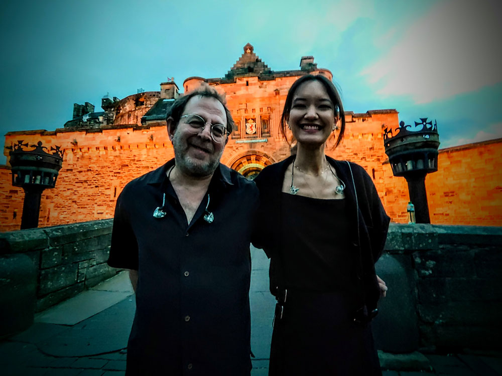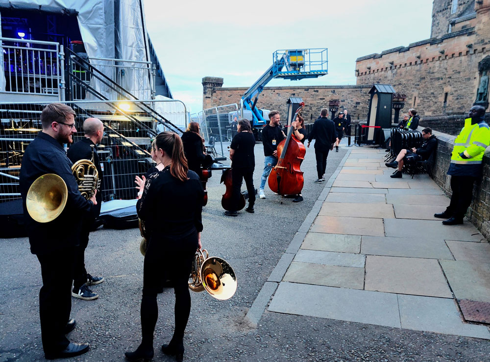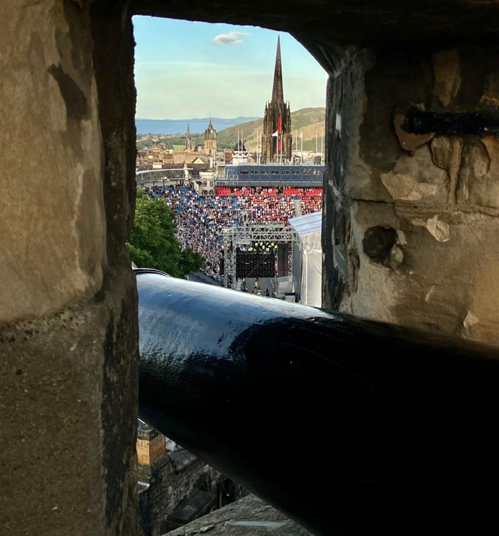 Before the show, we have two special guests coming in from the USA today. Cathy Cervenka and her mother had won a contest; a charity fund-raiser for Teen Cancer America. They won tickets and a meet-and-greet with Roger and Pete. But this was for the UK tour back in 2019! And that was canceled due to Covid. So finally, at long last, they are coming to a show, and they hand-picked the second Edinburgh Castle show (probably the best choice ever, as you’ll see.) We showed them around the stage, they met most of the band, got a free tour of the castle, and two sets of tickets – one down in front, and one pair back in the Royal Boxes where there is a bar, snacks, bathroom. We take care of our guests whenever possible!