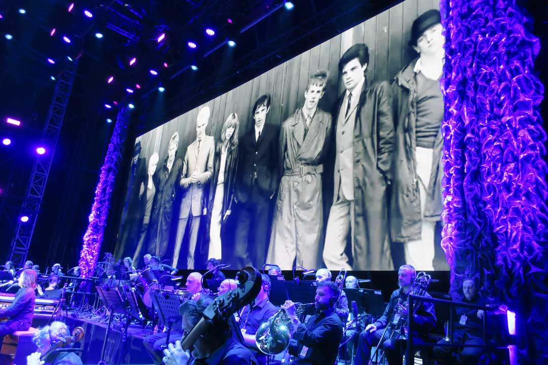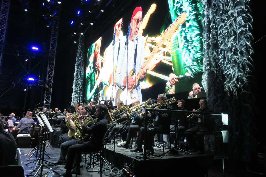 For this show, we have a huge single screen right behind the orchestra (I suspect that’s because there’s not room to hang the two side screens we usually have, and one bigger screen is more-easily seen by a huge crowd.) The video team and Tom Kenny have started our Tommy set with a simple image a shot of instruments and Who stuff that I made just before the first tour with orchestra began. (We needed something new for the passes that year, so I went to a prop house and put a Rickenbacker 12-string, one of Roger’s microphones, and some orchestral instruments in a big pile and photographed it.) The image really makes the point BUT is kind of artsy; it’s static but doesn’t take too much attention away from the show. They made a good choice in this. I like the idea – we’ve run moving animated videos on screens before, but this leaves the attention on the band and orchestra – you look initially at the image, then get back to the stage once this new scene is set. For the show, we gathered some images from artist/webmaster Richard Evans who holds a great Who archive of photos and graphics. The video team gathered some artistic and relevant background things – not active videos, but some did move, like a Union Jack flag that rustles as if blown by wind during ‘Who Are You’. Simple but effective. They had some graphics from a few previous tours, some of rain and vintage Who stage images. They interspersed this with live stage footage and shots of the huge audience – which the crowd loved, seeing themselves on the big screen. Cool stuff – and it made tonight’s show very special.