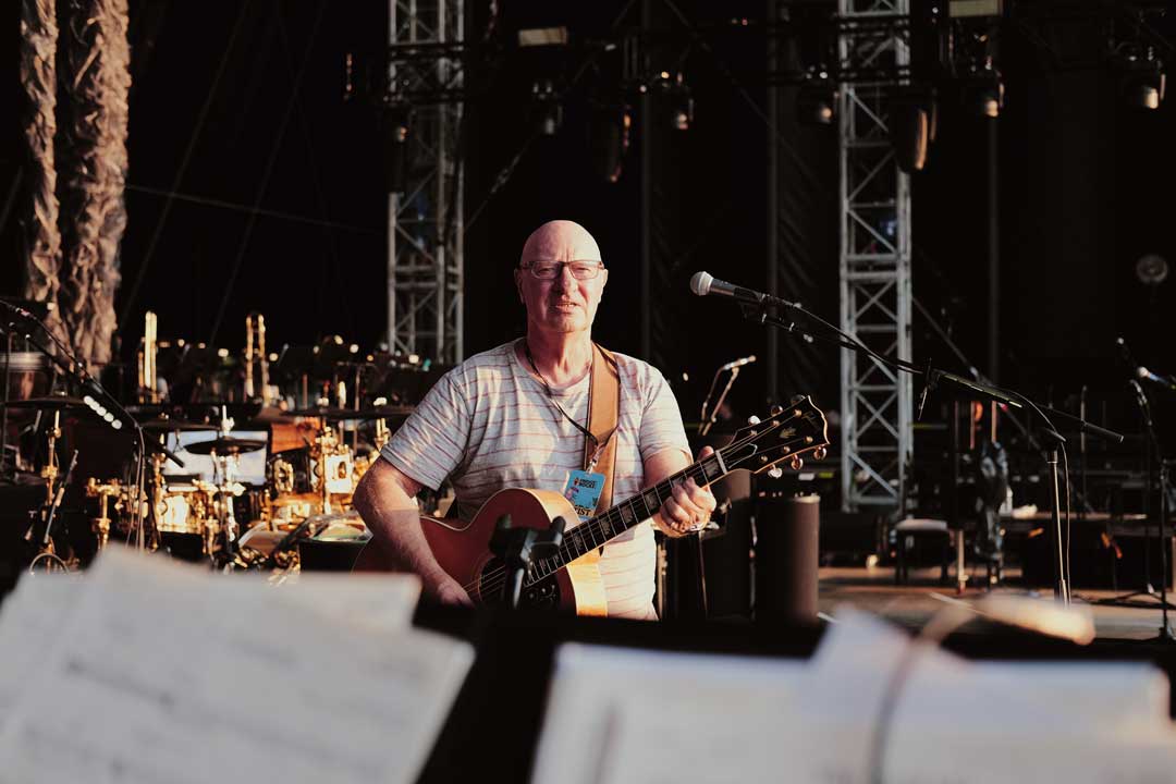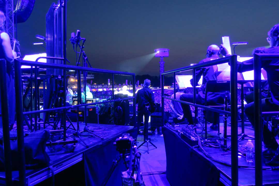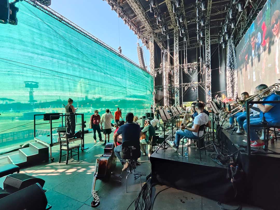 This is an outdoor festival, one of those huge stages, with a sort of village of small buildings behind for a backstage area; dressing rooms, catering, production offices. They put out some trees and Astroturf grass, so we don’t have to walk around on mud or dirt. There are hammocks and chairs, football tables for fun. Pretty standard stuff now, and costs a bit but makes everyone’s experience pretty pleasant. Yes, the air-conditioning is quite welcome as it’s certainly hot outside still. We came in to set up a day early; because this is a festival, we need to rehearse the local orchestra, and the whole day will be filled with other bands. So we need to prep and rehearse today with all the gear – and a screen across the stage to shield everyone from the sun. But then, at least, tomorrow is the show day without any setup to do, just walk in and play. We spend almost the whole day though, building the stage and lights, plus orchestra and band rehearsal – we leave at night, feeling as if we have done a show’s worth of work. It’s a little strange.
