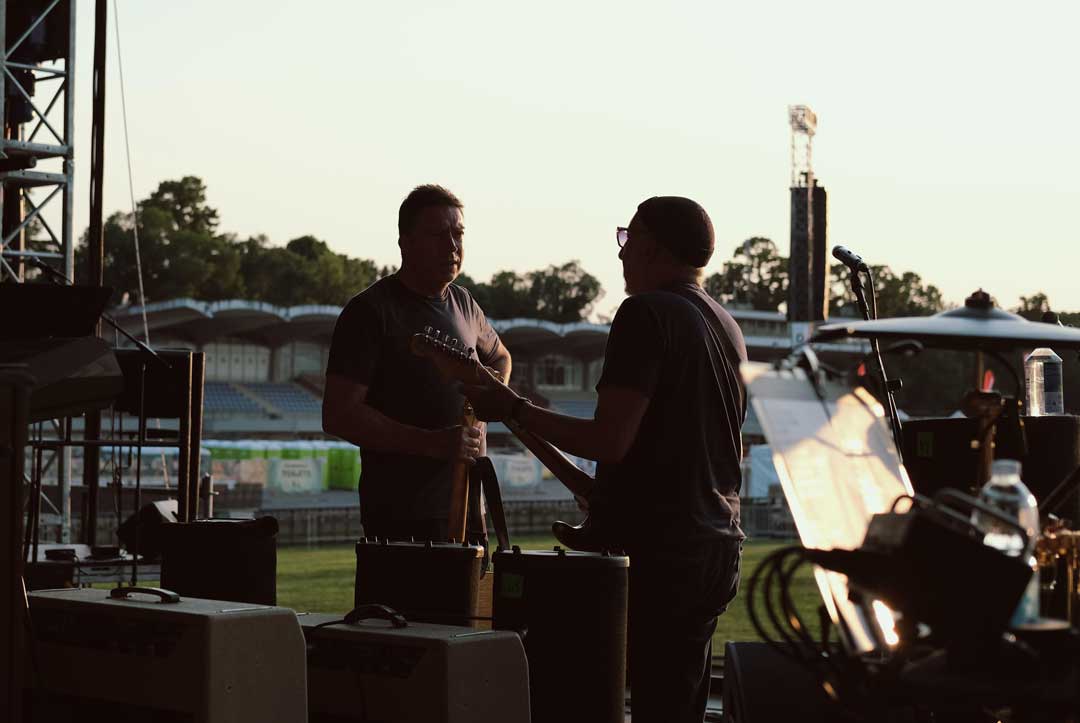 We have this big screen behind the stage. Everyone can see it but it’s MOST critical for those way in the back. I’d estimate we have 20-30,000 people here today, hard to tell. But that’s pretty far back for those in the rear – they really need a video screen. Here’s where it gets tricky – things move at a certain speed: “Light speed” how fast light moves – it’s really fast, almost instant. Sound moves much slower – and you know this, because if you yell in a canyon (or even a sports court) it “bounces” off the opposite wall and comes back later – an echo or delay of sound. So imagine Zak hitting his snare drum onstage, the video races out to the back people almost immediately, but the sound takes a while maybe one second, to reach the back. If they were runners, the video runs very fast and would outpace our sound runner. So our clever video guys have put a delay, holding back the video signal so that it starts just a bit later – so that the video and slower audio sort of end up together near the back. Because everyone else also sees the video, they have to sort of find a middle-ground, so that people in the front don’t see such a bad delay effect; the people in front get a little timing error when they compare visual to sound (but those people don’t need the screen as much, as they can see the stage clearly without it.)