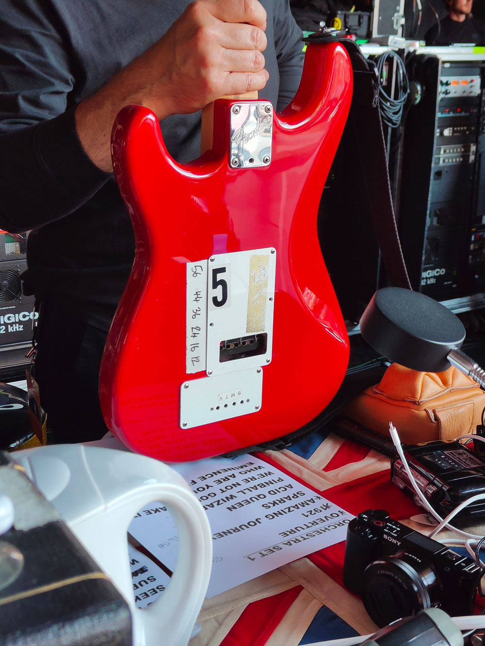 Pete’s #5 red Stratocaster in the hands of Simon Law, his guitar tech