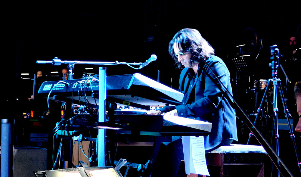 They contract a for-hire orchestra called The Heart of England Philharmonic. They’re on the younger side, and there are many teachers and professionals who also work for musicals and touring rock/pop bands. They seem eager, and not the stuff-shirt classical type. In fact, quite a few of these players have done previous shows with us already, such as Wembley Stadium. At one point in the show, Pete announces that since they are called “The Heart of England, then they must be from Hull!” A nice sentiment, well-received. But not quite true, since most of them seem to be from Birmingham area, the Midlands, so they are centrally-located. Pete says that we all know that such musicians start very young to be a symphonic player, with years and years of practice until you can sight-read almost anything you put in front of them. “That leaves me plenty of free space to pretend I’m a lead guitar player!” he jokes.