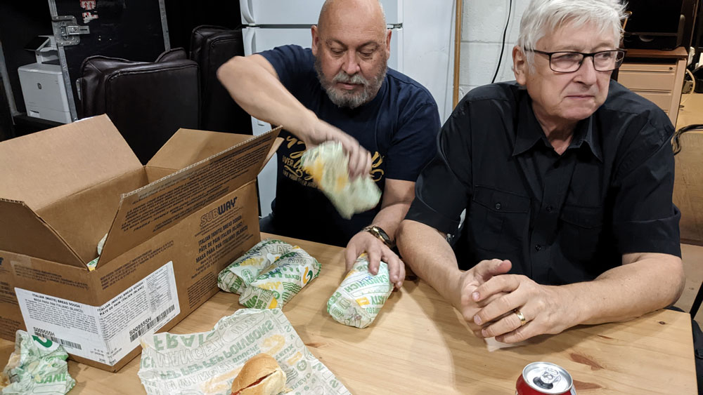 Our location was new to us but very accommodating – MDC Studios (formerly Track Toronto) is a large private complex that houses several studios, mixing and filming rooms, voiceover, podcasting – and our big rehearsal room. Even though our main room is fairly massive, it’s not big enough for our orchestra platforms – but they are not needed for this kind of band-oriented musical testing. MDC’s Gina Phillips and their team really made it easy and comfortable, and brought us some classic Canadian food options – the donuts with maple syrup and bacon on top were a prime example!