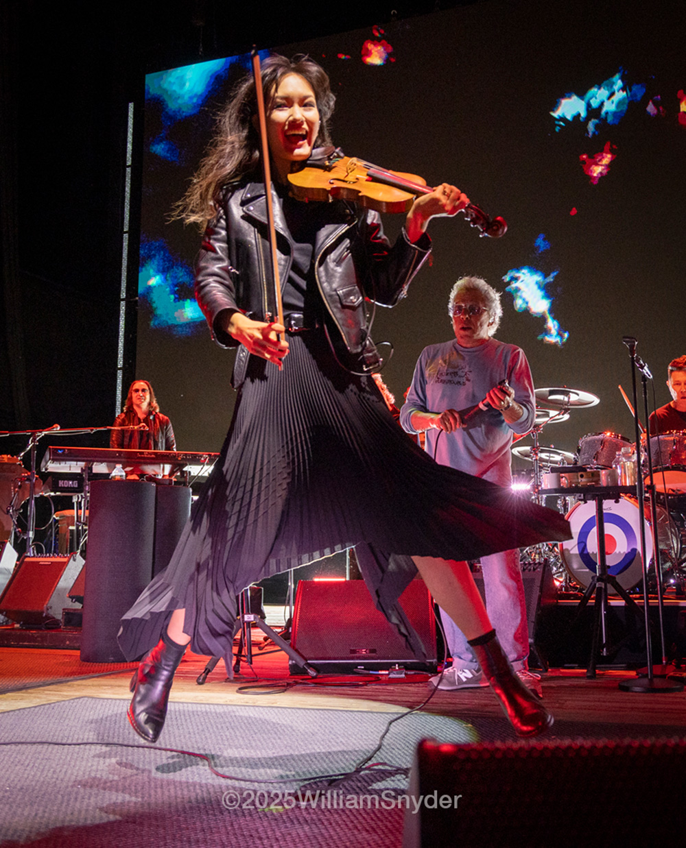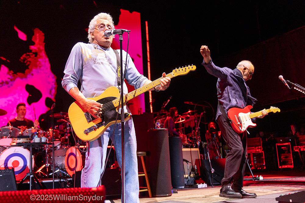 ‘The Real Me’ is loose, and almost a train-wreck musically. They know it, there are some heated words and actions onstage. But ‘I’m One’ recovers with beautiful floating sounds coming from Roger’s harmonica and Simon’s careful added harmonies. ‘5:15’ starts wonky, so Pete halts it and starts once again – not that uncommon in our world. Perfection is almost impossible, yet they don’t mind a flaw, as long as it doesn’t continue too long. The audience is seen fully now as the stage lights are beaming out. The crowd are all moving to the big riff of ‘5:15’ and it starts to energize the band to see them going. ‘Love Reign O’er Me’ hits, and I know already – it’s just going to be great: I know what this audience is in for… And as it closes, everyone’s on their feet making tons of noise. And we’re about to hit them harder because we start the ‘Baba O’Riley’ backing track, which is like an irresistible drug – people hear that and freak out! And just when ‘Baba’ is winding up, this crowd gets hit again – as Katie Jacoby comes out on violin for the solo. She’s back – a last-minute decision to add her to the tour again. She’s always pleasant and fun to have around, both on The Who’s and Roger’s tours. But the recent set of shows where the harmonica solo just wasn’t there – this was a weak spot when we really need the impact. So, certainly at considerable expense, they invited Katie to join our tour for the duration. And it works great – the peak is there and Roger and Pete are smiling big. Following ‘Baba’, we start ‘Won’t Get Fooled Again’ – a 1-2-3 punch of the best Who tracks in a line, and there’s no escaping it. This audience is won over, another strong night.