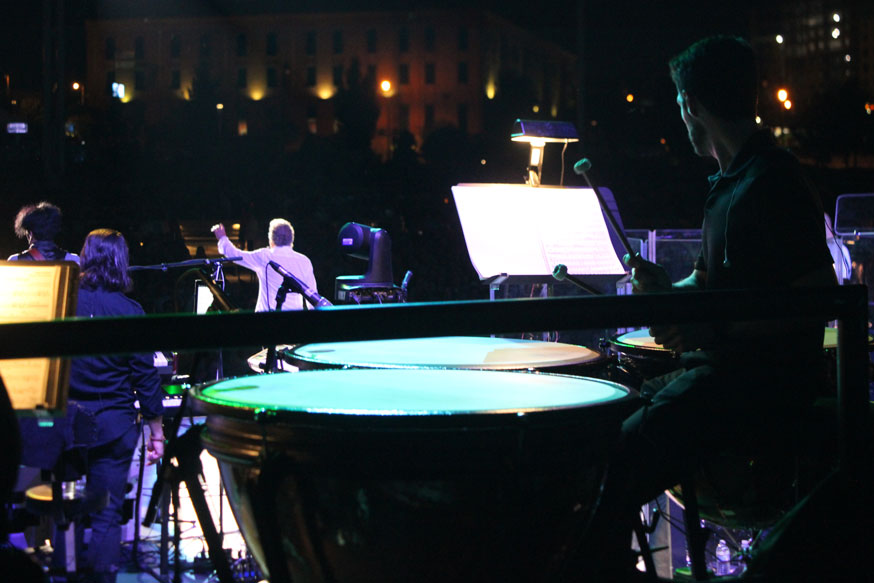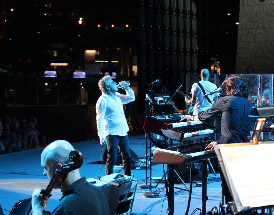 The orchestra met in a room downtown, working with Keith Levenson and Katie Jacoby representing our touring crew for the afternoon. Keith learned that they did not know they were playing with a rock band, they did not want to, and were also unhappy with our use of click tracks for timing, headphones for some, and even our need to space them widely across the stage (to make room for our band.) Not a great start! Meanwhile we set up outside on the stage in oppressive heat and humidity – it alternates between heat and wet. We realized this stage had a weird, flat sound, like playing in a field; no richness or warmth. It’s not a wooden stage or an enclosed space – all the things a concert hall ‘gives you’ to enhance a performance. Missing here. (Luckily we use microphones on each instrument, so the PA system can carry the sound out as if the stage were reflecting it to the crowd.) The sonics here might be good if you were a fast, hard metal band, but we’re not . . .