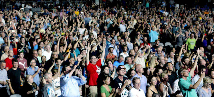 As luck would have it, the dreaded thunderstorm missed us by just a few miles, and the evening turned beautiful. The full moon was out sometimes between the clouds, and clearly visible from the stage. The lights of the town’s buildings and bridge added to the simple light show our man Jim Mustapha has been doing (We don’t carry a full system of lights with us as The Who do, too expensive. We use local rigs to work with the show for that night . . . )