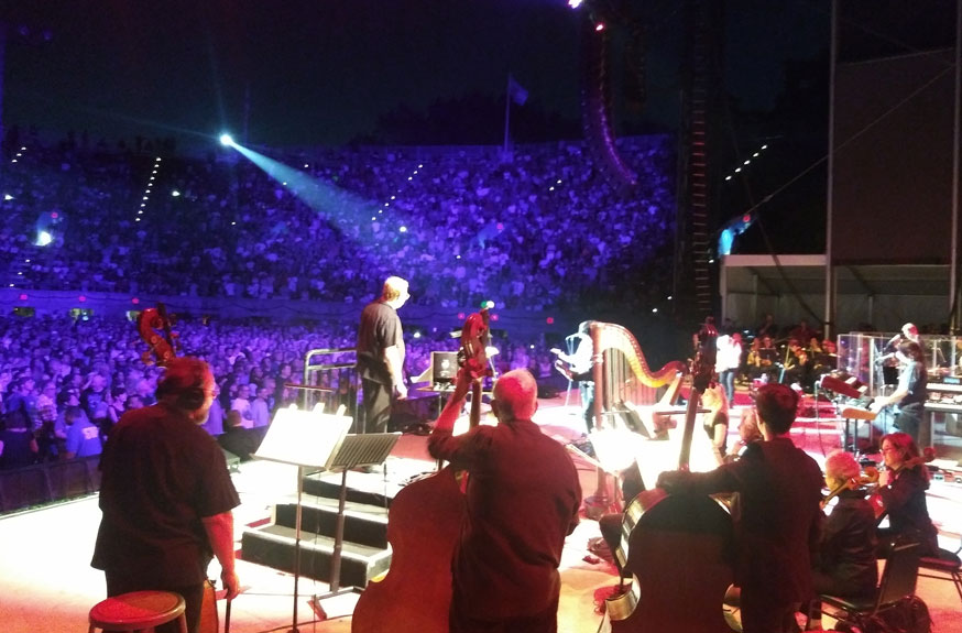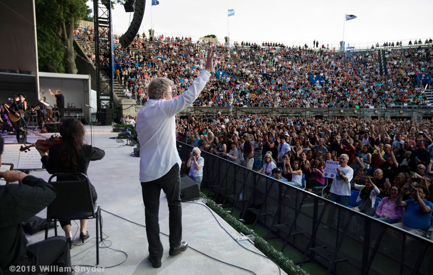 Roger came out, and warmed up the crowd quickly – the VERY first second he stepped onstage. A huge scream went up and we were off; this audience was out to have a great time. They know Tommy, and sang along to everything, and stood and danced and so on, with a beautiful view from the stage as the setting sun behind them outlined their bodies at the top of the seats. (It looked very much like the end of the Tommy film, against the sun. . . . )